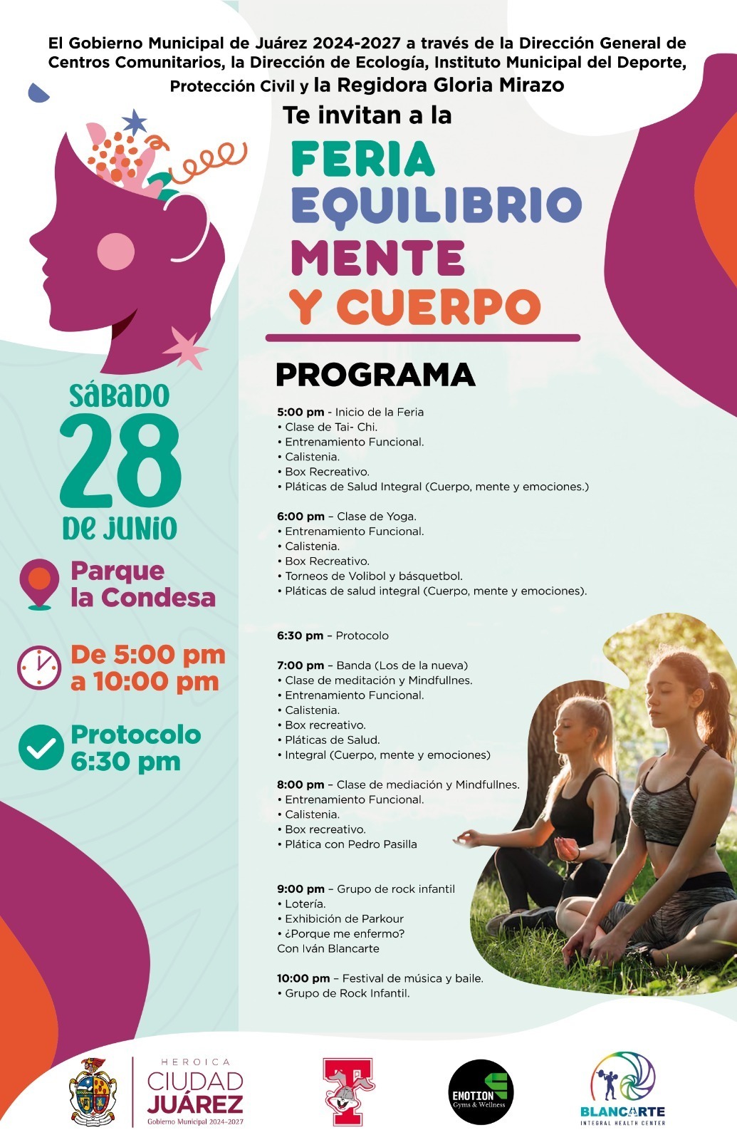 El Gobierno municipal a través de la Dirección General de Centros Comunitarios, la Dirección de Ecología y el Instituto Municipal del Deporte, invitan a la comunidad a la Feria Equilibrio, Mente y Cuerpo.