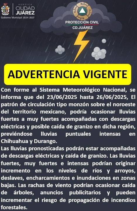 De acuerdo con el Sistema Meteorológico Nacional, este fenómeno estará presente desde hoy lunes 23 al próximo jueves 26 de junio y podría ocasionar precipitaciones intensas acompañadas de descargas eléctricas y posible caída de granizo, especialmente en los estados de Chihuahua y Durango.