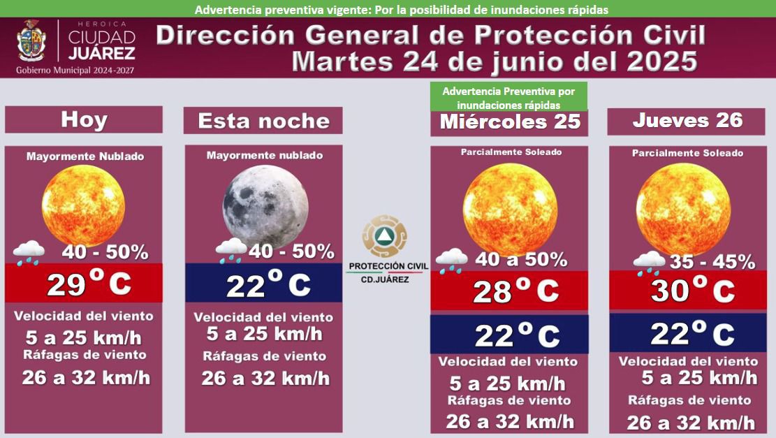 La Dirección General de Protección Civil emitió una advertencia preventiva vigente por la posibilidad de inundaciones rápidas, ante las condiciones meteorológicas previstas para los próximos días.