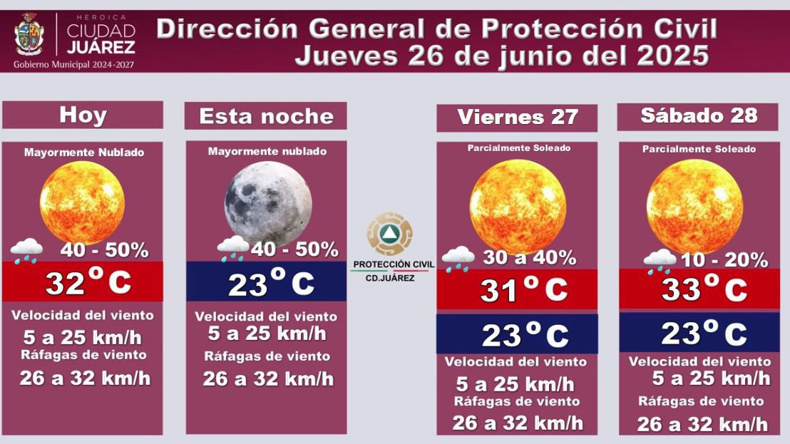 La Dirección General de Protección Civil del Municipio dio a conocer el pronóstico del clima para los próximos días, destacando condiciones mayormente nubladas y probabilidad de lluvias en la región.
