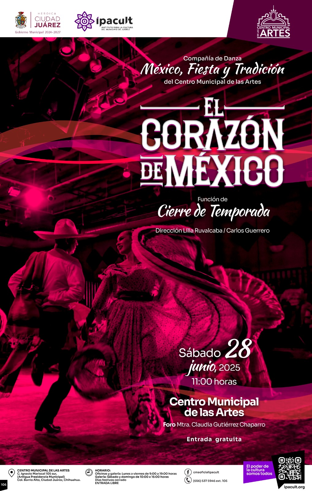 El Instituto para la Cultura del Municipio de Juárez (IPACULT) extiende una cordial invitación a la ciudadanía para disfrutar del espectáculo de danza “El corazón de México”, que se presentará de manera gratuita este sábado 28 de junio a las 11:00 de la mañana en el Centro Municipal de las Artes (CMA).