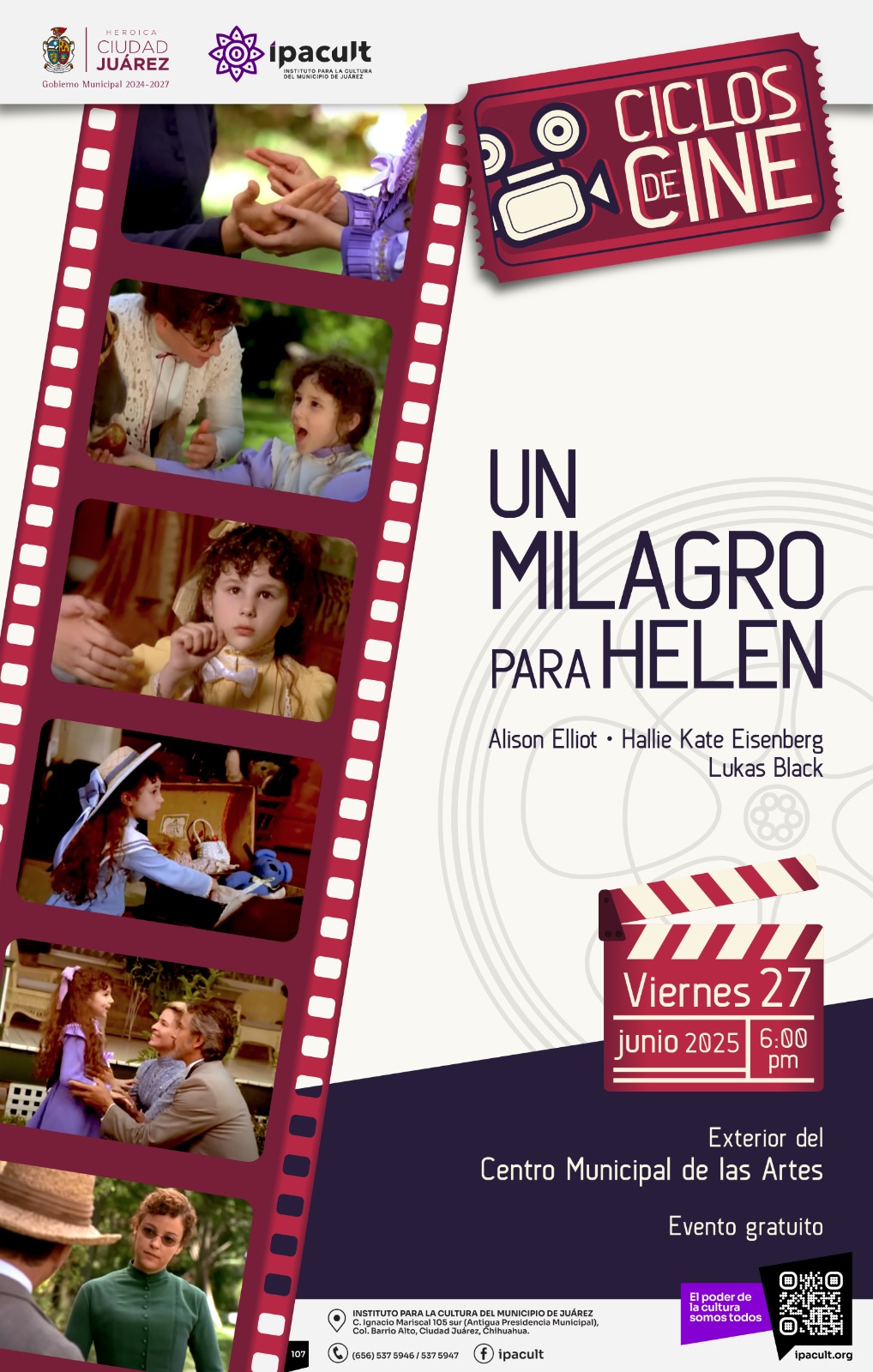 El Instituto para la Cultura del Municipio de Juárez (IPACULT) continúa con su labor de acercar el arte y la cultura a la ciudadanía mediante su programa Ciclos de Cine, que este viernes 27 de junio presentará la película “Un milagro para Helen”.
