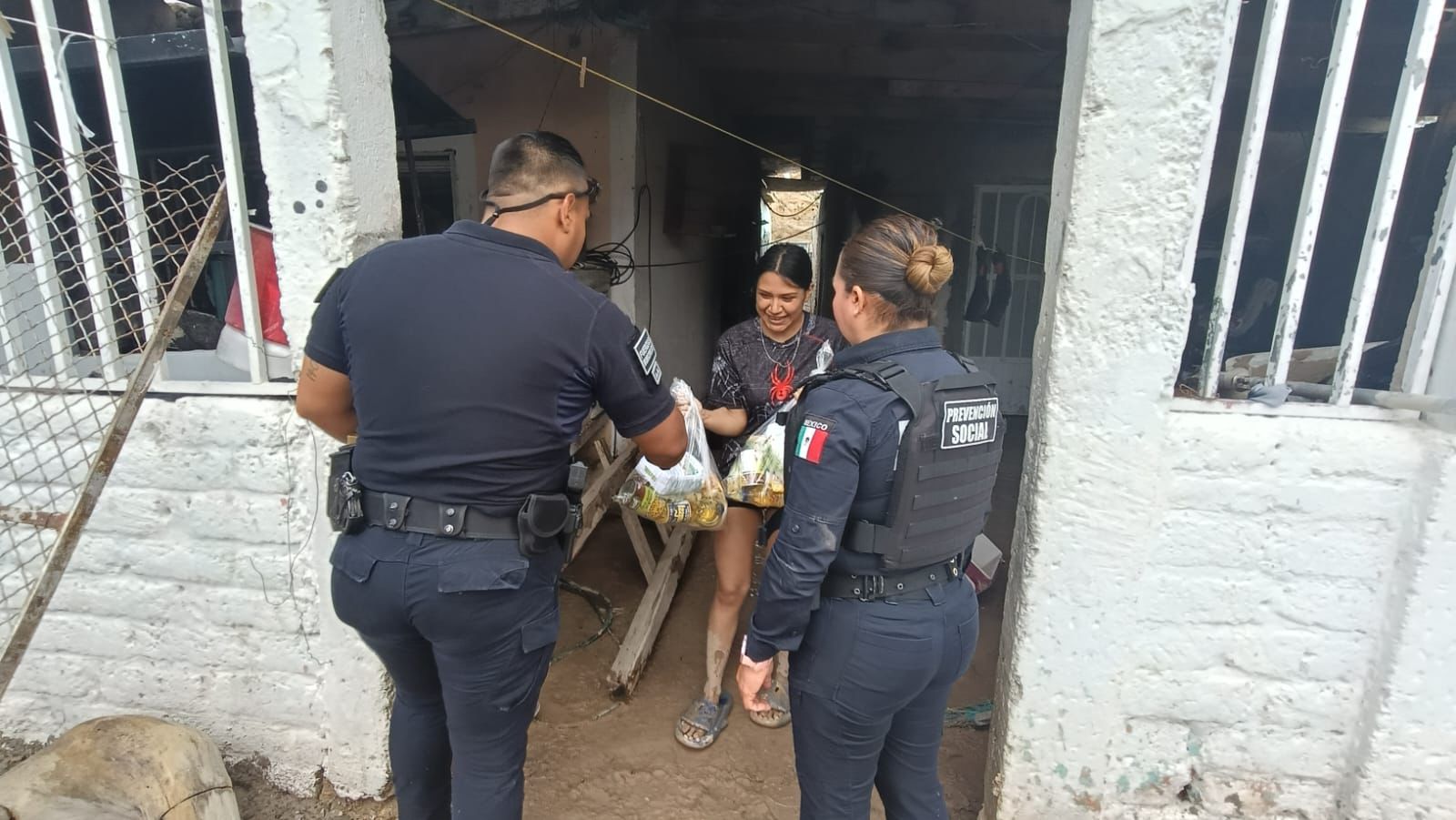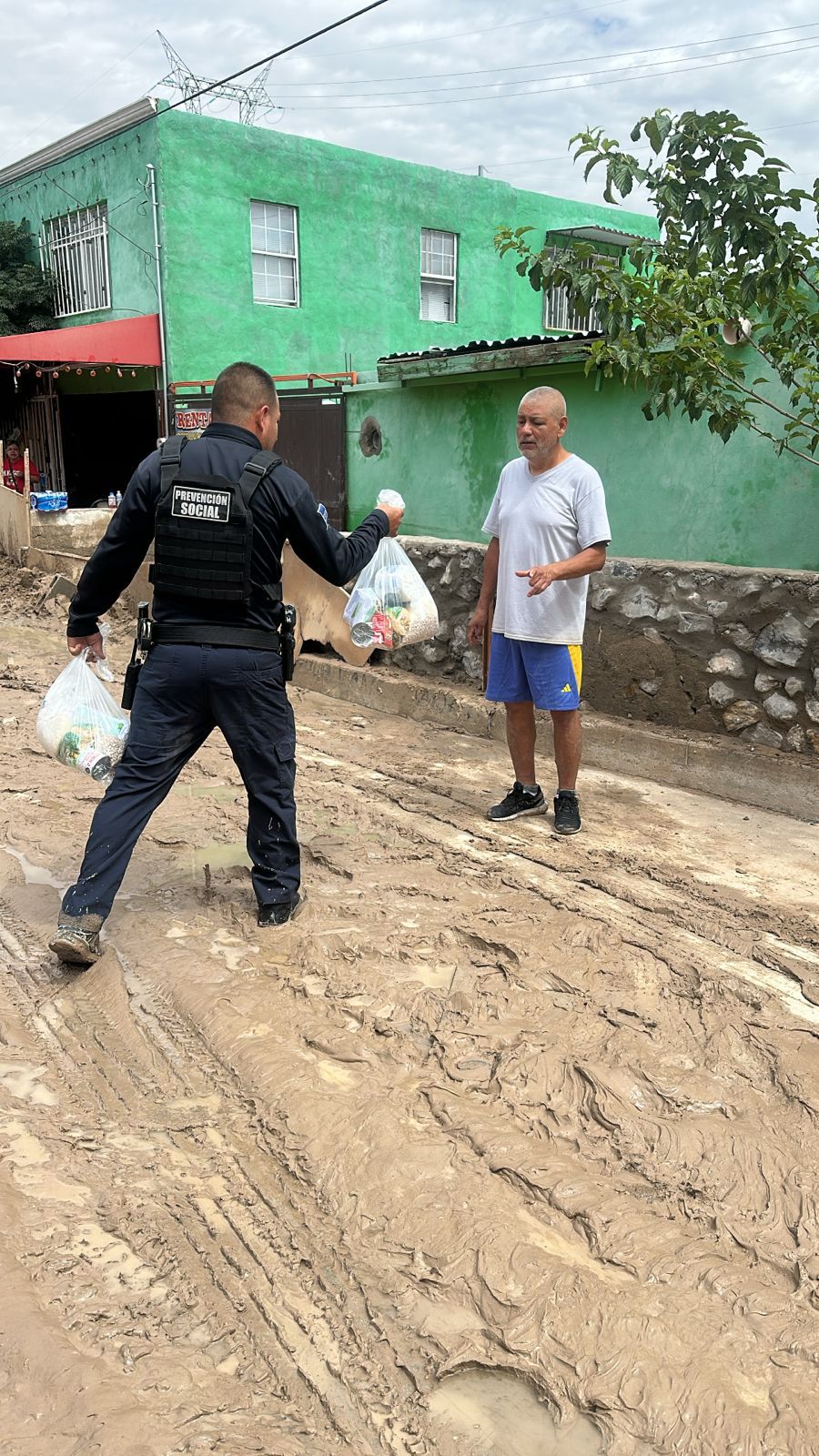 Elementos de la Secretaría de Seguridad Pública Municipal pertenecientes a la Dirección de Prevención Social, acudieron a dar su apoyo a familias afectadas por la lluvia con entrega de despensas.