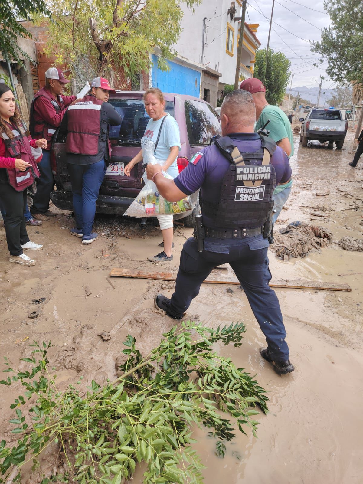Como gesto de ayuda y solidaridad, elementos municipales acudieron al norponiente de la ciudad, donde se presentaron con despensas básicas para apoyar a los vecinos de las colonias Hermenegildo Galeana, Chaveña, Fronteriza y Felipe Ángeles, entre otras, en donde ciudadanos resultaron perjudicados por las recientes lluvias.