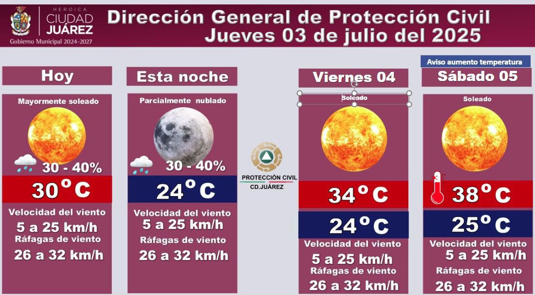 Para mañana viernes 4 se pronostica un día soleado con una temperatura máxima de 34 grados centígrados y mínima de 24. El viento continuará con velocidades entre 5 y 25 kilómetros por hora, con ráfagas de hasta 32 kilómetros por hora.