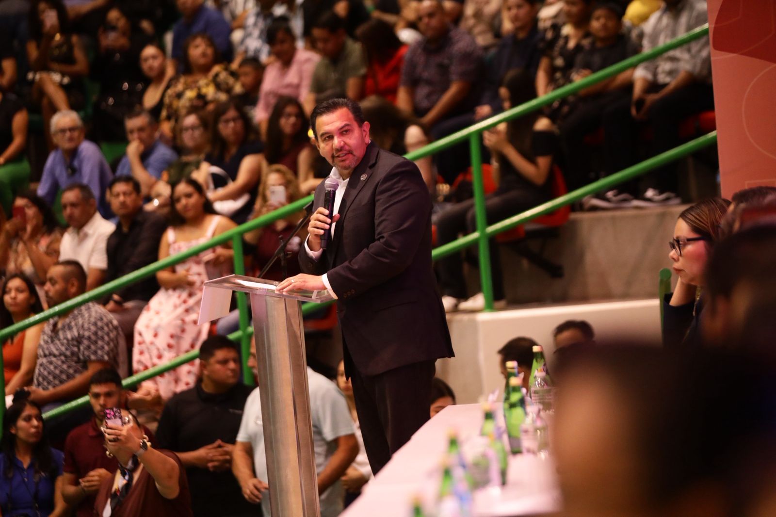 El alcalde reconoció también al equipo del CBTIS 114, tanto al personal administrativo como docente por su dedicación y profesionalismo para influir en sus alumnos, de los que hoy algunos se integran al sector productivo mientras continúan con sus estudios profesionales.