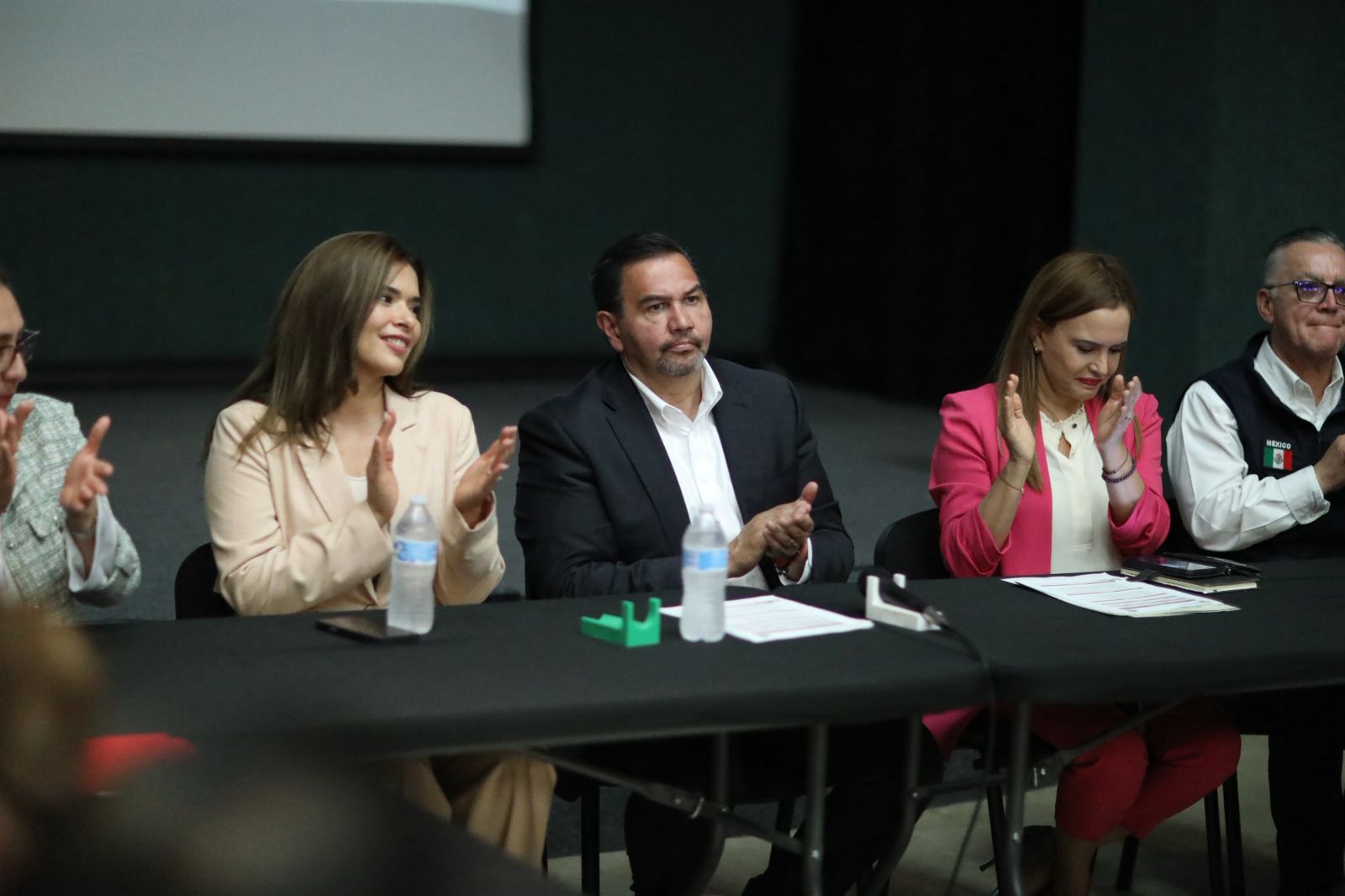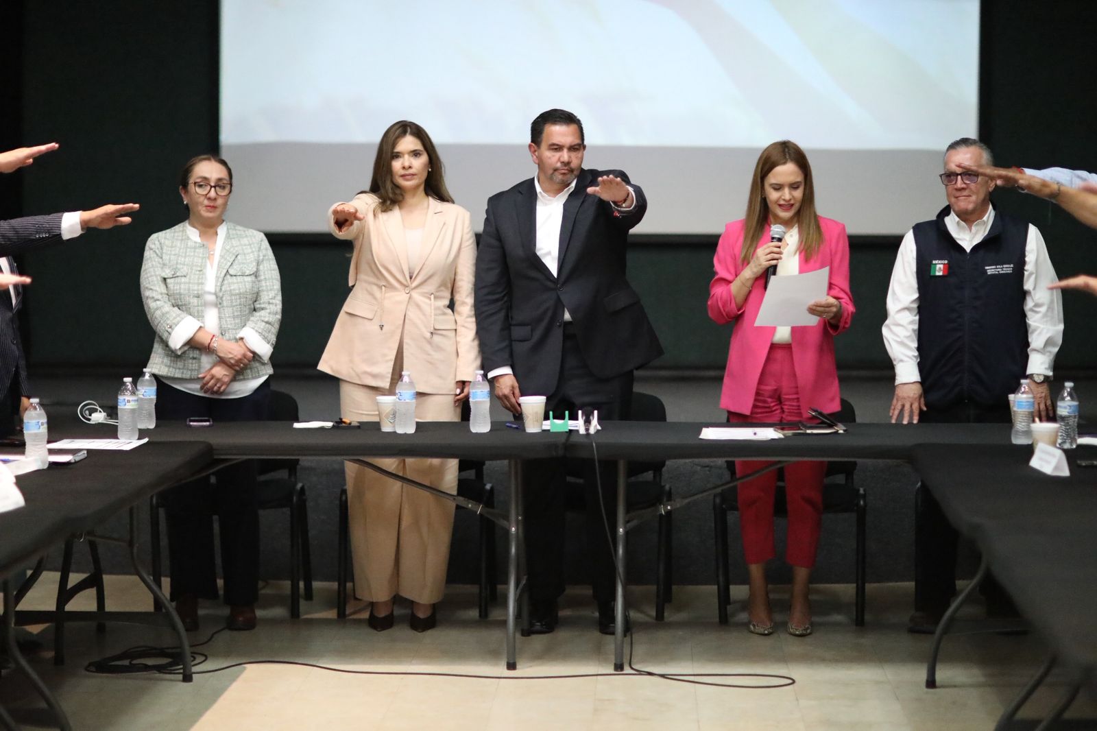 El presídium en la ceremonia donde se instaló el Consejo también estuvo conformado por la Presidenta del DIF Municipal, Rubí Enríquez; el director regional de Bienestar en Juárez, Omar García Palomares y Fernando Ávila, secretario técnico de la Mesa de Paz Estatal.