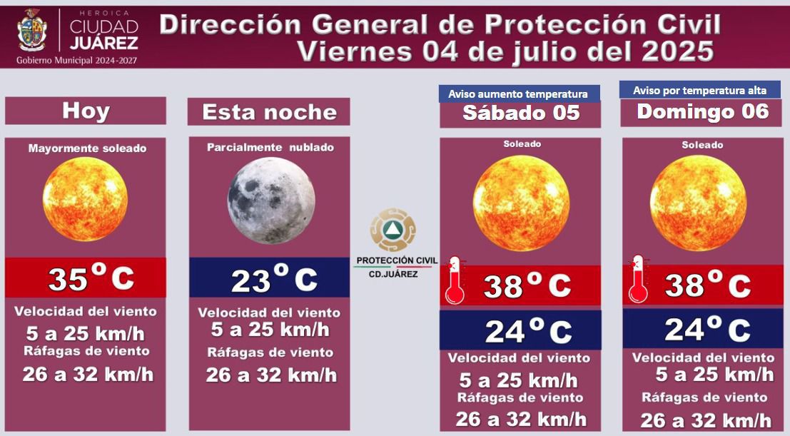 El sábado 5 y domingo 6 de julio, se prevé un aumento en la temperatura, alcanzando los 38 °C como máxima y 24 °C como mínima. Ambos días serán soleados, con condiciones similares en cuanto a viento: ráfagas de entre 26 y 32 km/h.