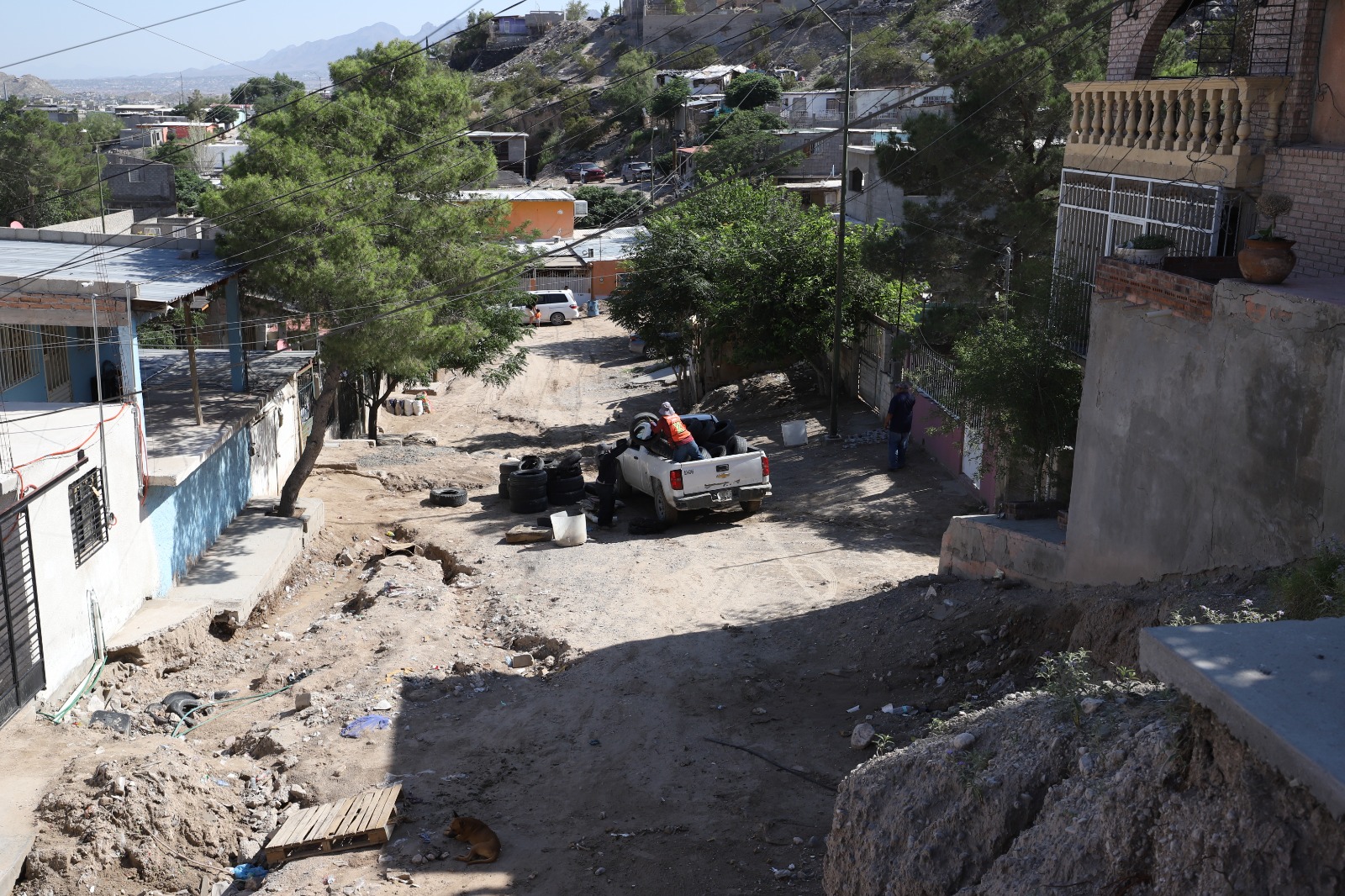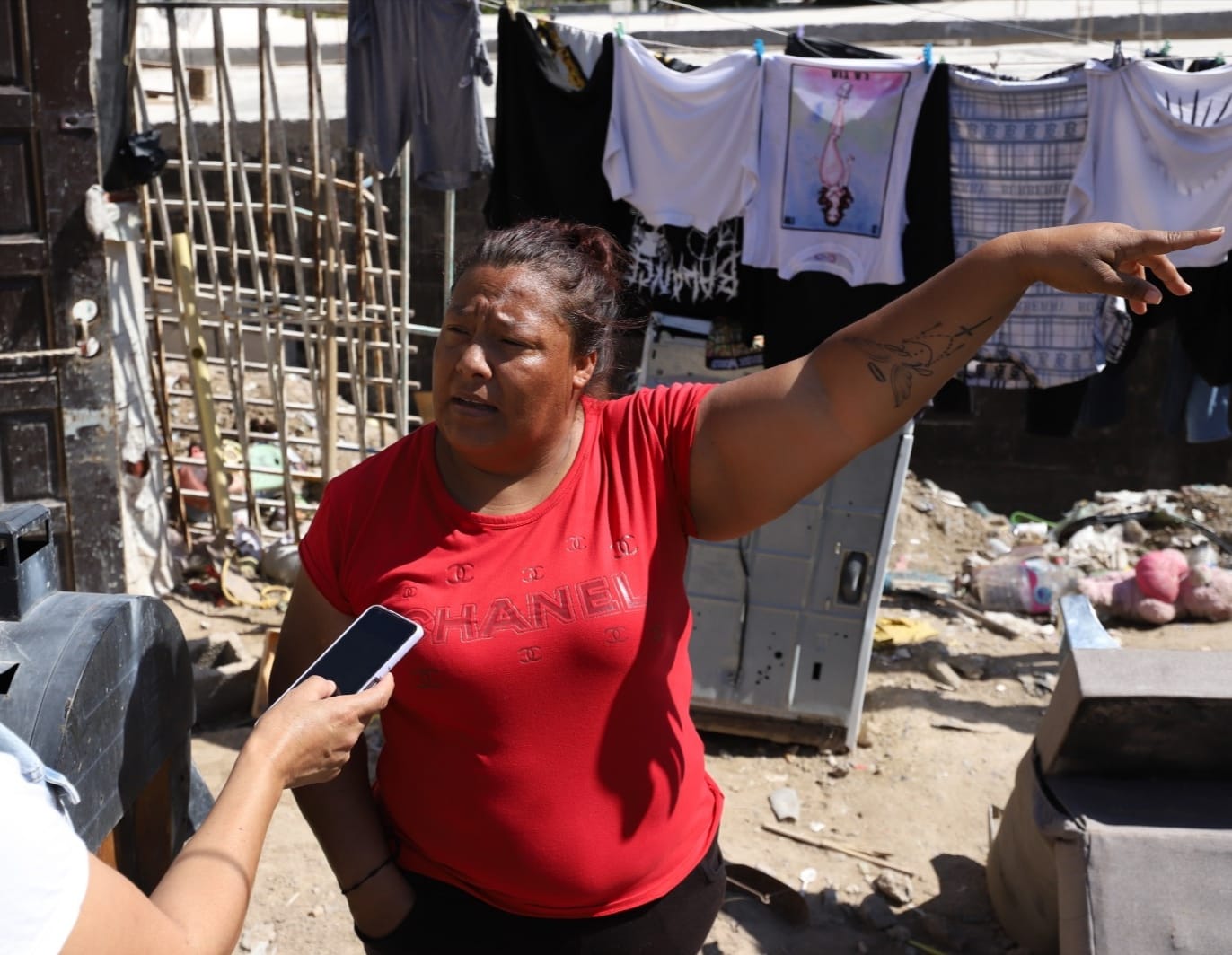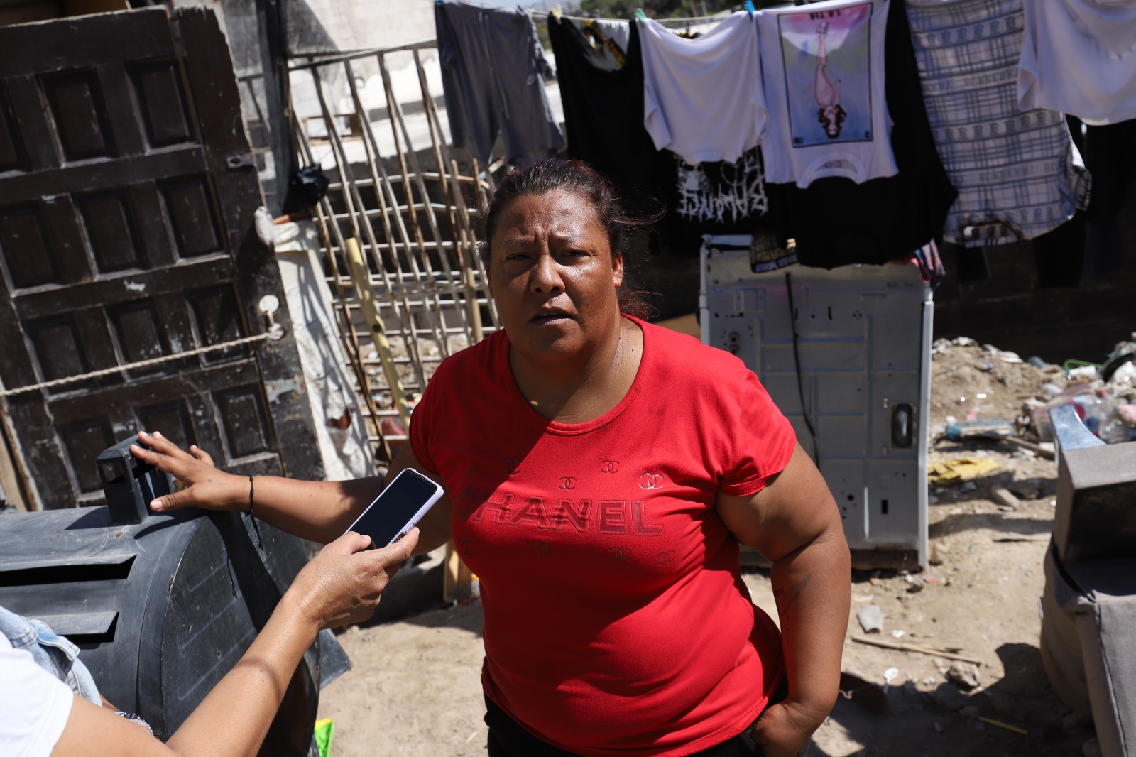 Marisol Macías habita en la colonia Fronteriza Baja, a un costado del socavón; la mujer fue afectada por las lluvias y actualmente la apoyan cuadrillas de la Dirección de Limpia, ya que en su vivienda no solo ingresó el agua de lluvia, sino que las llantas, tierra y tiliches provocaron que la barda se cayera.