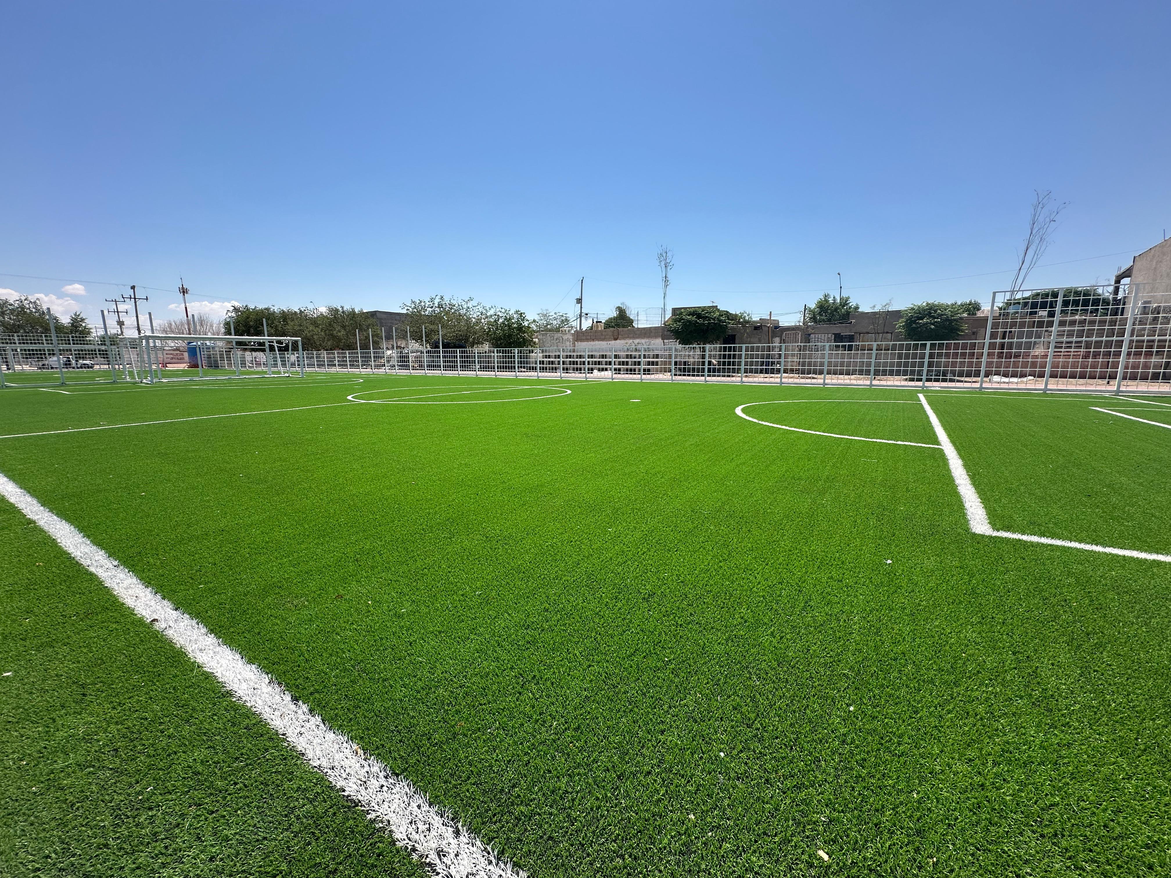 Detalló que las canchas incluirán pasto sintético, porterías, así como mobiliario urbano y juegos, mesas de picnic, trabajos hechos con una inversión de 10 millones 811 mil pesos.