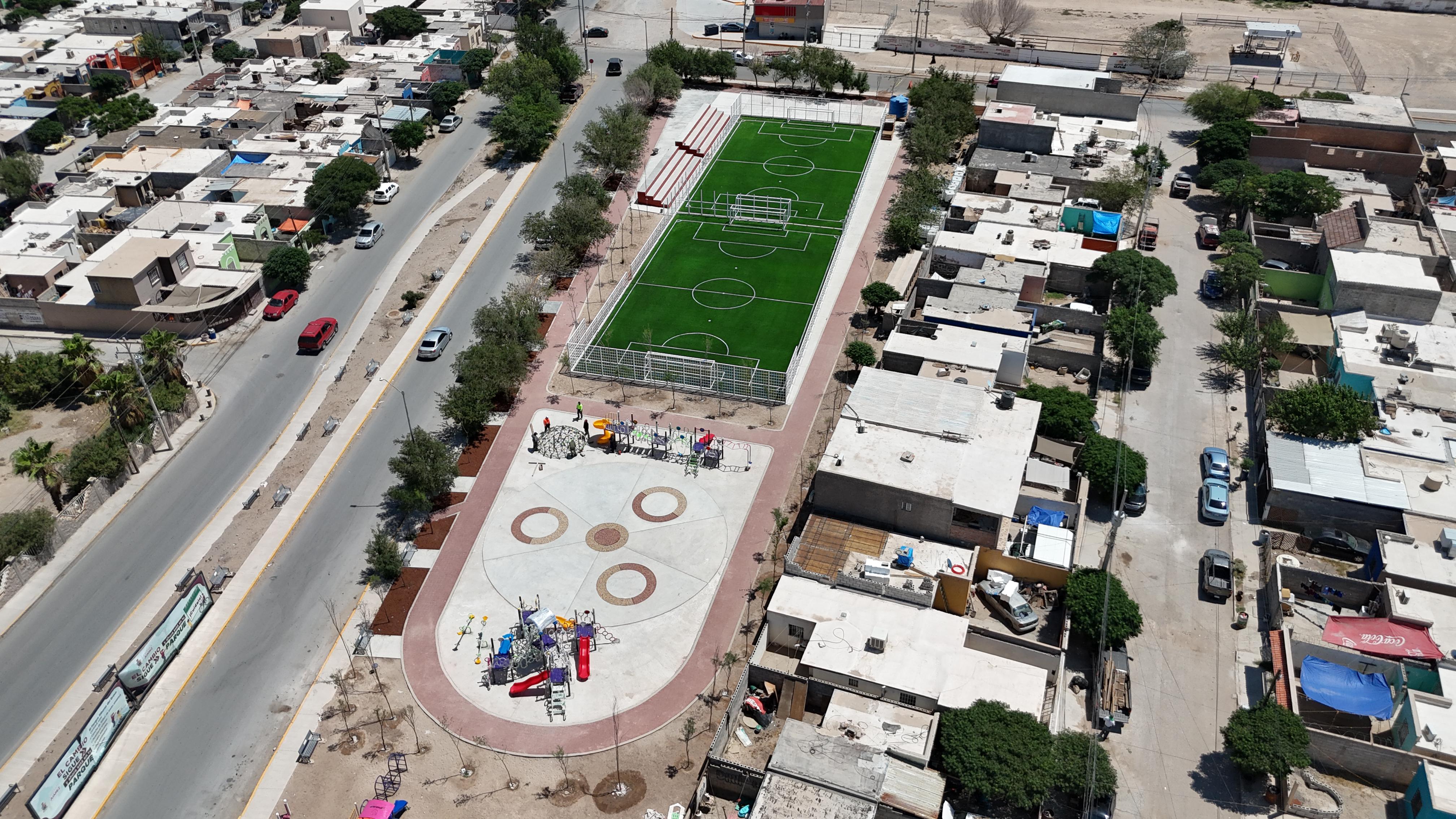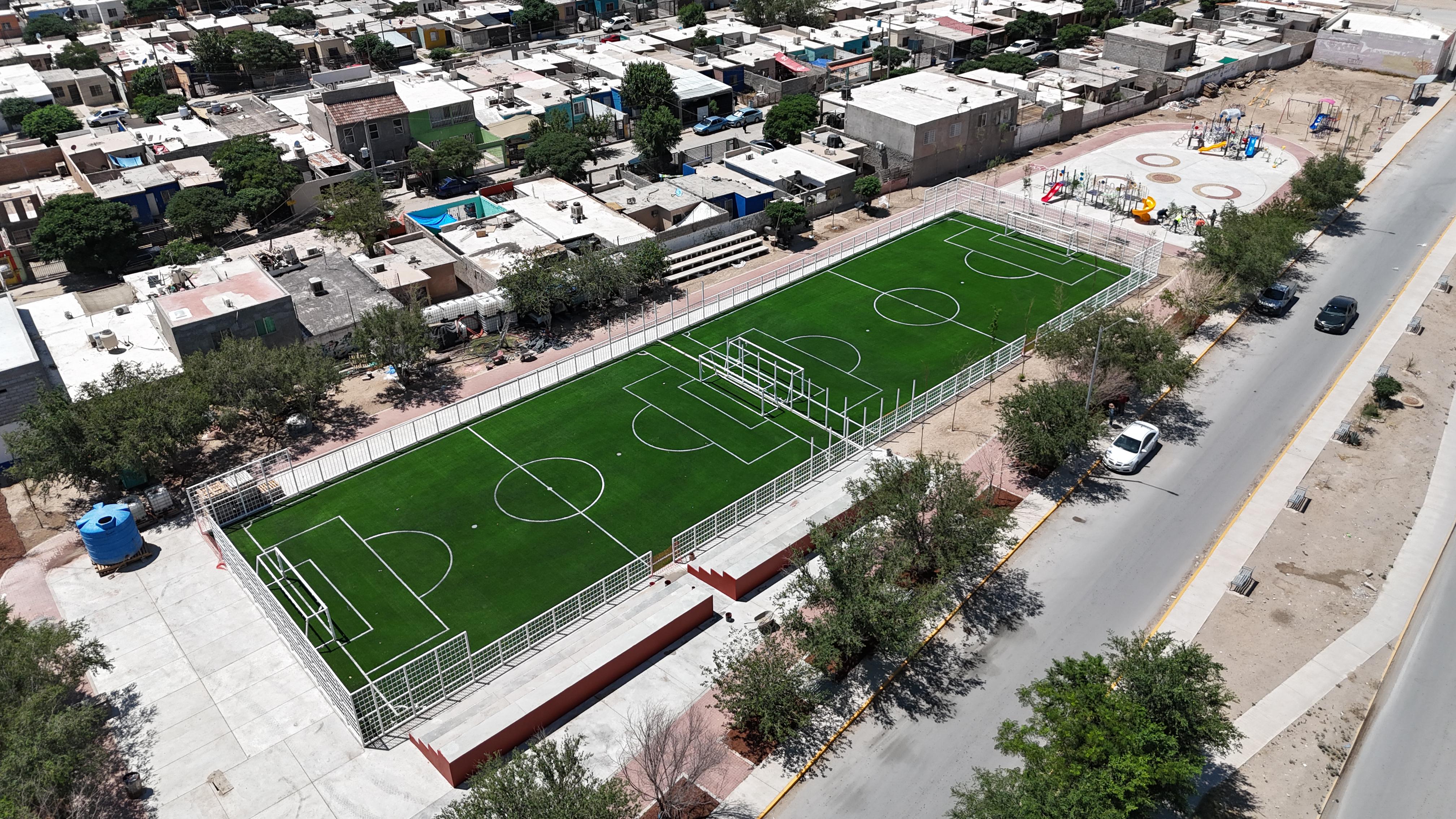 Avanzando en el mejoramiento de espacios públicos en el área del fraccionamiento Riberas del Bravo, la Dirección General de Obras Públicas afina detalles en el parque Riberas del Bravo, ubicado entre las calles Rivera del Salado y Rivera Peñasco, el cual contará con dos canchas de fútbol rápido.