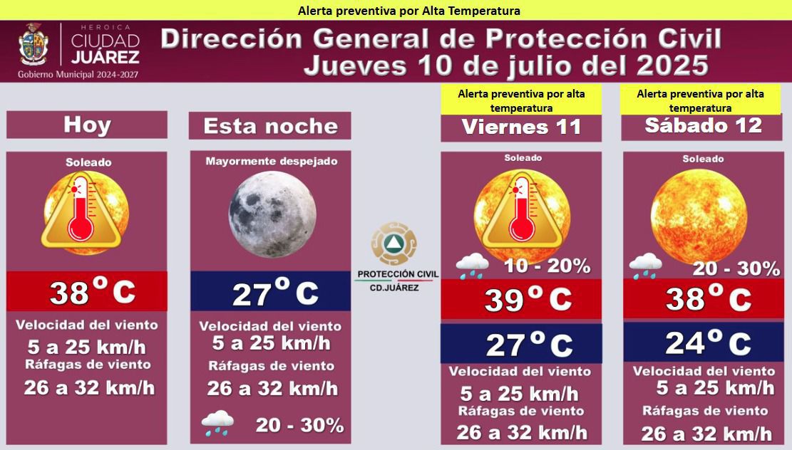 La Dirección General de Protección Civil del Municipio de Juárez emitió una alerta preventiva por altas temperaturas para los días jueves 10, viernes 11 y sábado 12 de julio de 2025.