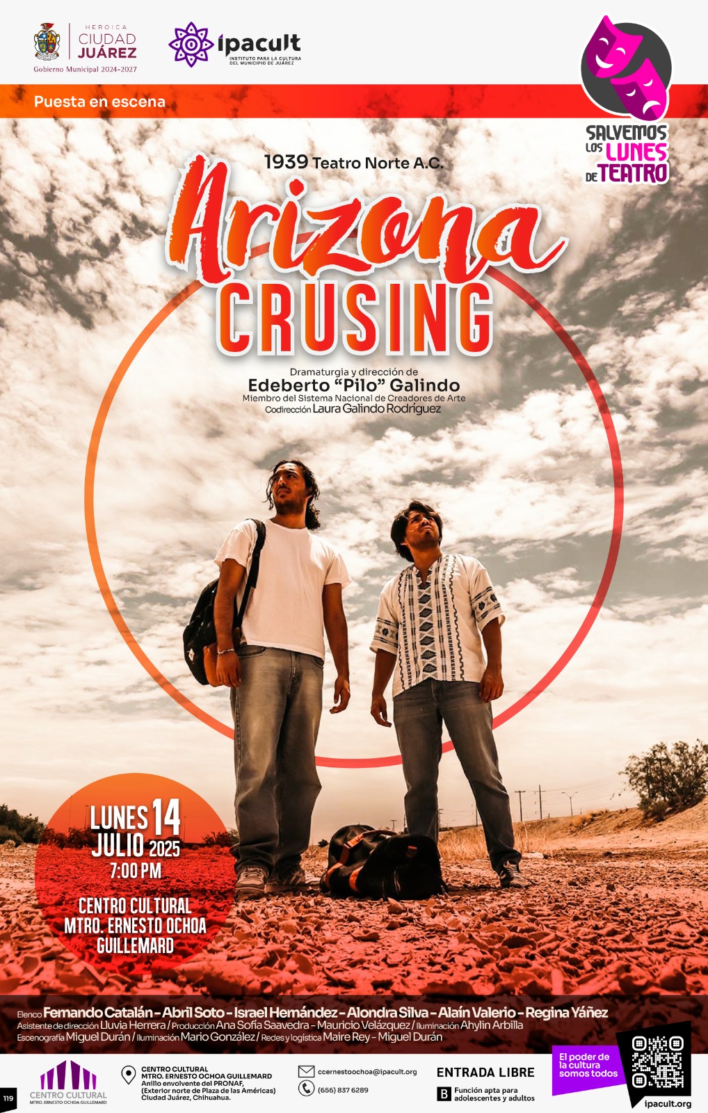 Como parte del programa Salvemos los lunes de teatro, el Instituto para la Cultura del Municipio de Juárez (IPACULT) invita a la presentación de la obra “Arizona Cruising”, el próximo lunes 14 de julio a las 7:00 de la tarde en el Centro Cultural Ernesto Ochoa Guillemard.