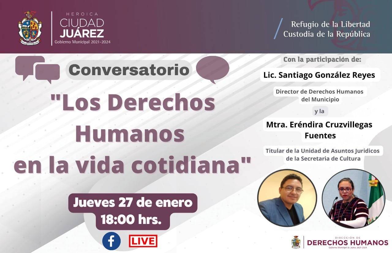 González Reyes informó que este conversatorio se llevará a cabo el próximo jueves 27 a las 6:00 de la tarde, el cual se puede seguir en línea a través de la red social Facebook ??Dirección de Derechos Humanos del Municipio de Juárez?.