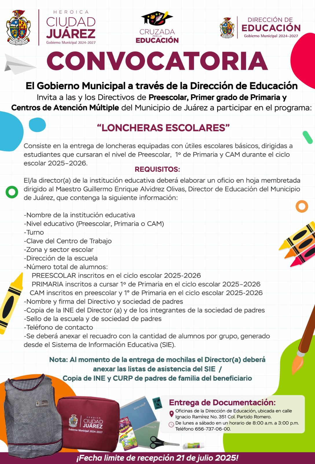 Miércoles 16 de julio de 2025.- El Gobierno Municipal, a través de la Dirección de Educación, lanza la convocatoria a directores de instituciones públicas de preescolar, primaria y Centros de Atención Múltiple (CAM) para participar en el programa de entrega de loncheras escolares.