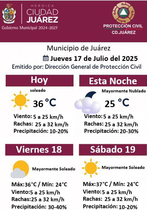 La Dirección General de Protección Civil del Municipio de Juárez emitió este jueves 17 de julio del 2025 el pronóstico del clima, informando que para hoy se espera un día soleado con una temperatura máxima de 36 grados centígrados. Los vientos oscilarán entre los 5 y 25 kilómetros por hora, con rachas de 25 a 32 km/h, y una probabilidad de precipitación del 10 al 20 por ciento.