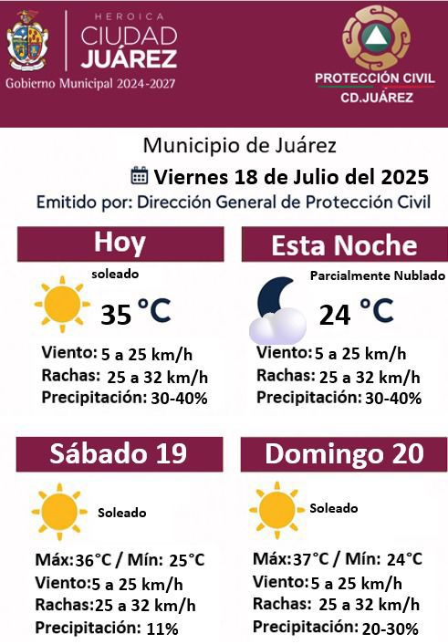 La Dirección General de Protección Civil del Municipio emitió el pronóstico del clima para este viernes 18 de julio, en el cual se anticipa un día soleado con una temperatura máxima de 35 grados Celsius.