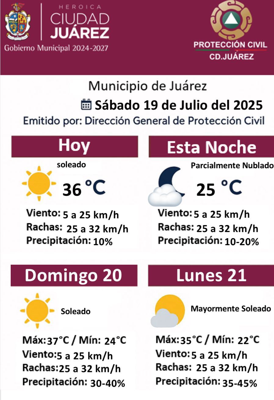 La Dirección General de Protección Civil del Municipio de Juárez emitió el pronóstico del clima correspondiente al sábado 19 de julio de 2025, el cual indica condiciones mayormente soleadas durante el fin de semana.