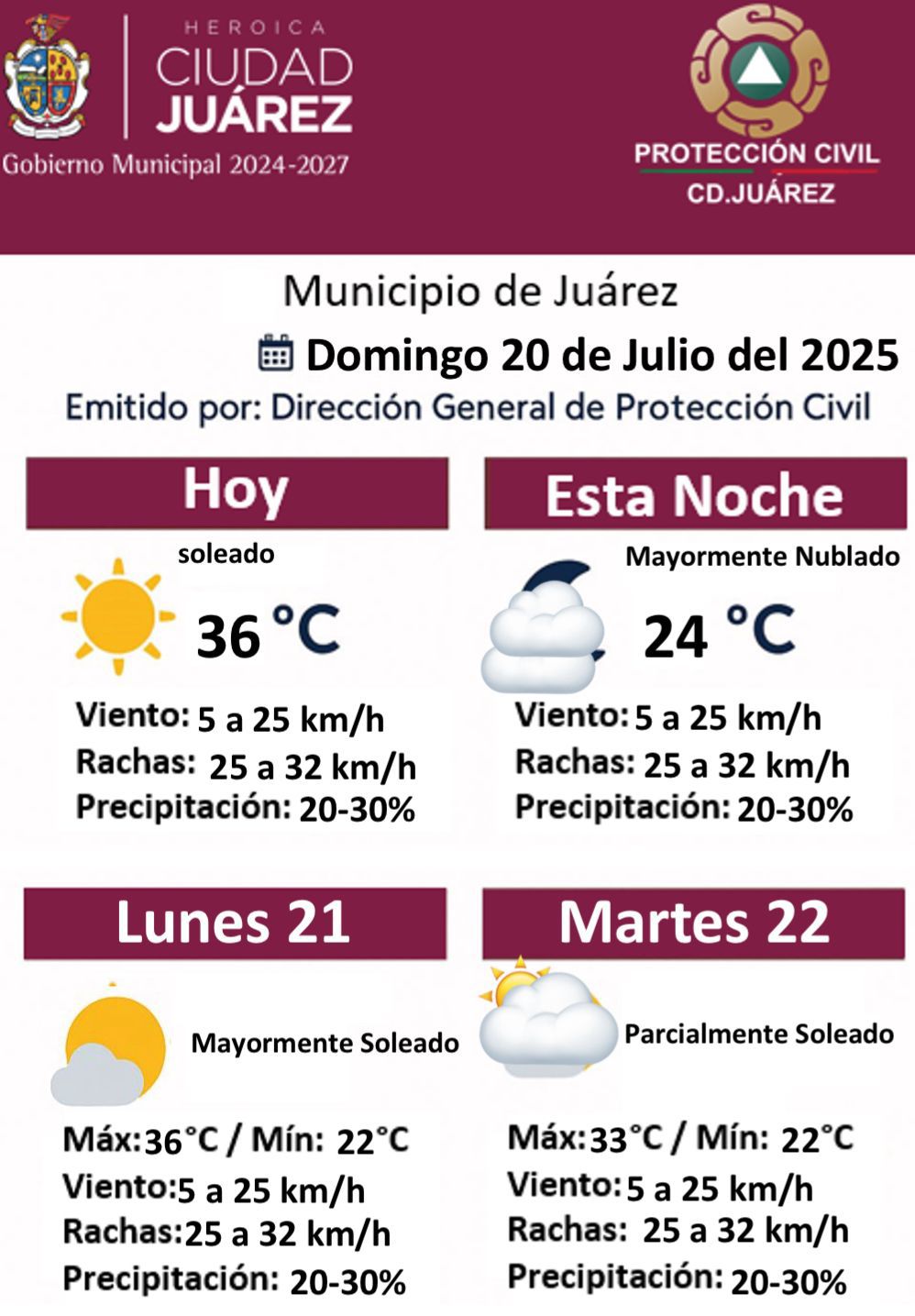 La Dirección General de Protección Civil del Municipio de Juárez emitió el pronóstico del clima correspondiente al sábado 19 de julio de 2025, el cual indica condiciones mayormente soleadas durante el fin de semana.