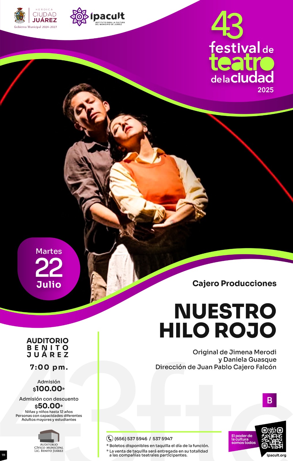 El Instituto para la Cultura del Municipio de Juárez (IPACULT) da inicio a la edición número 43 del Festival de Teatro de la Ciudad con la presentación de la obra “Nuestro hilo rojo”, este martes 22 de julio a las 7:00 de la tarde en el Auditorio Cívico Benito Juárez.