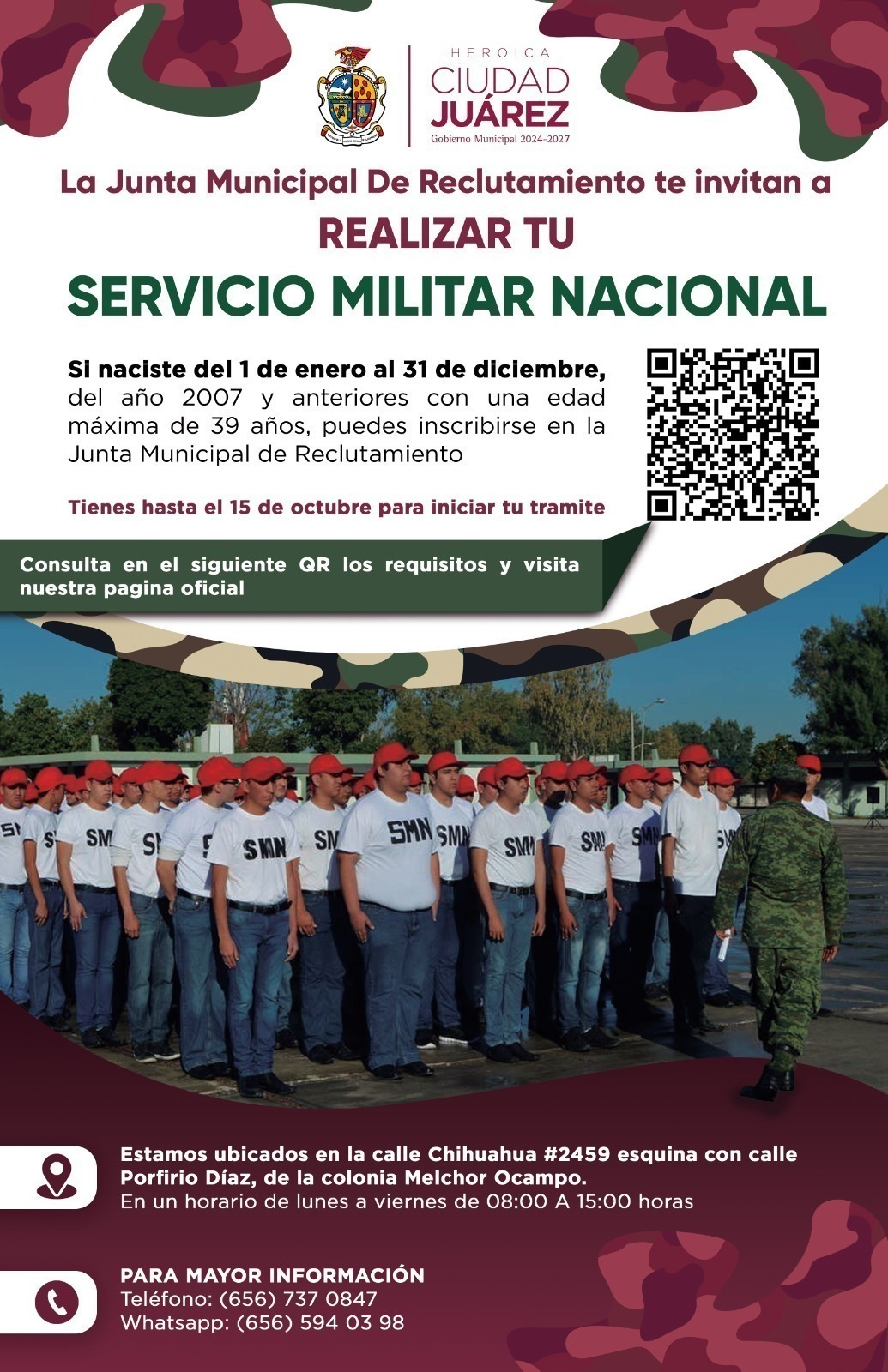 La Junta Municipal de Reclutamiento de Ciudad Juárez invita a los jóvenes a registrarse para cumplir con el Servicio Militar Nacional y obtener su Cartilla Militar.