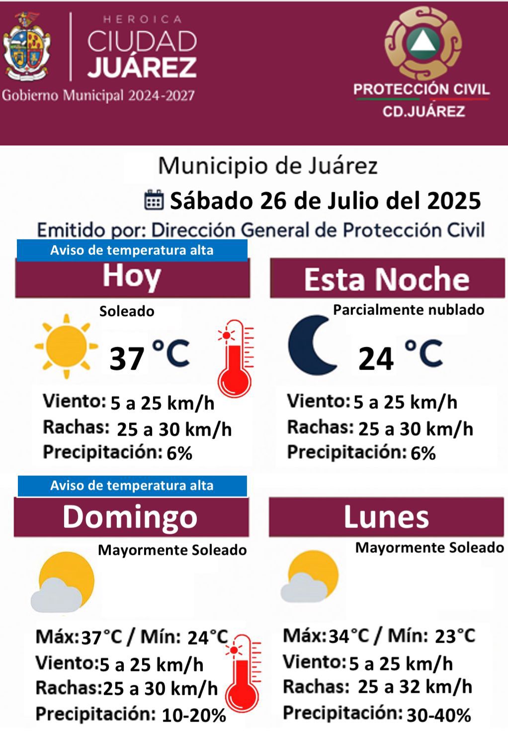 La Dirección General de Protección Civil del Municipio de Juárez emitió un aviso de temperatura alta para este sábado 26 de julio de 2025, debido a las condiciones climáticas extremas que se presentan en la región.