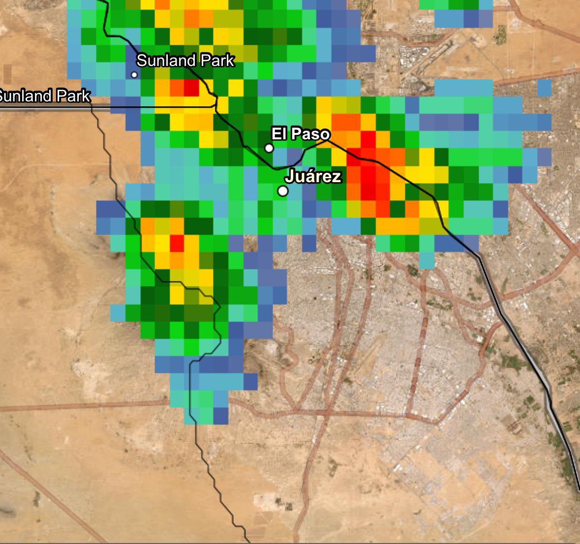 La Dirección General de Protección Civil informa que el radar meteorológico muestra múltiples tormentas en desarrollo sobre territorio municipal, principalmente en las zonas norte y oeste de Ciudad Juárez. Las condiciones meteorológicas actuales continúan favoreciendo la formación de nuevas tormentas. Por el momento, se registra lluvia mayormente de intensidad ligera a moderada en diversos puntos de la ciudad.