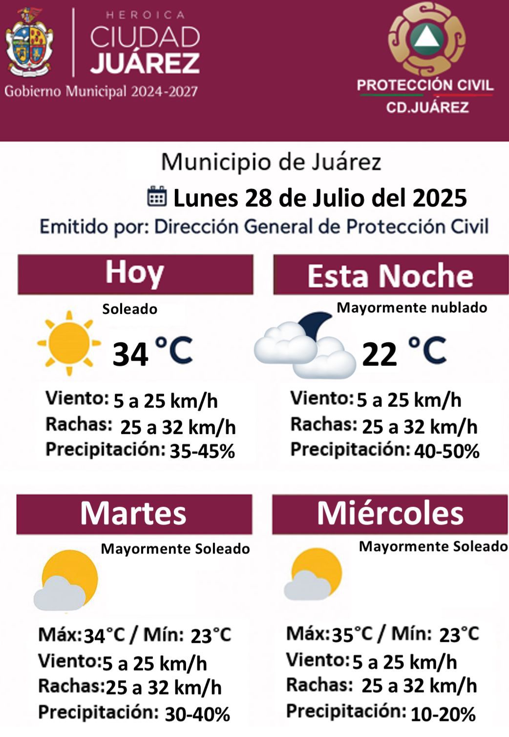 La Dirección General de Protección Civil del Municipio de Juárez emitió el pronóstico del clima para este lunes 28 de julio del 2025, destacando condiciones mayormente estables con posibilidades de lluvia.