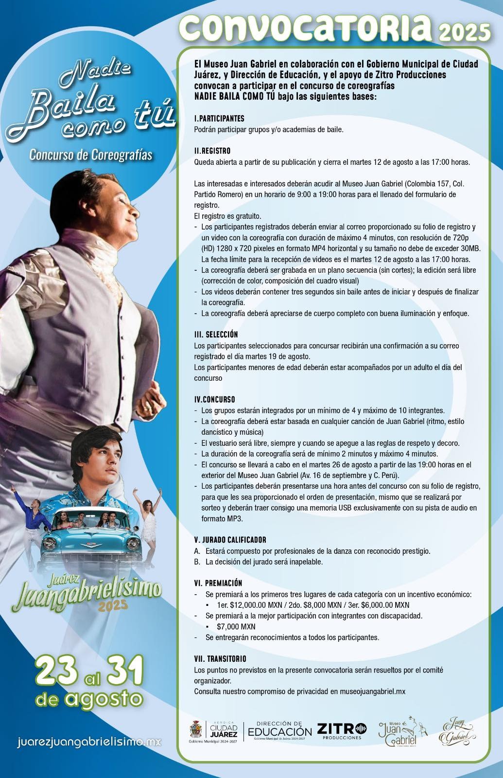 La Dirección de Educación Municipal, en colaboración con el Museo Juan Gabriel y Zitro Producciones, lanzó la convocatoria al concurso de coreografías “Nadie Baila Como Tú”, como parte del festival Juárez Juangabrielísimo 2025.