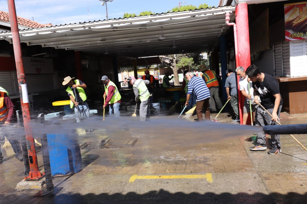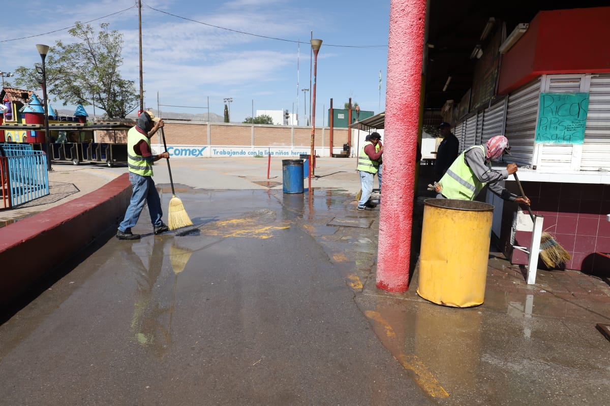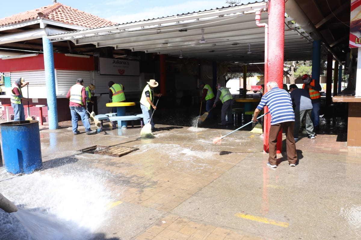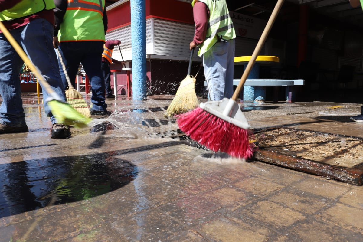 Esta mañana, el personal de Limpia se desplegó sobre el área de venta de alimentos del Parque Borunda para limpiar los pasillos con la ayuda de varios comerciantes que se sumaron al operativo.