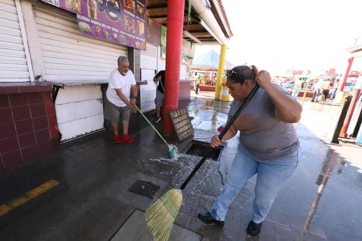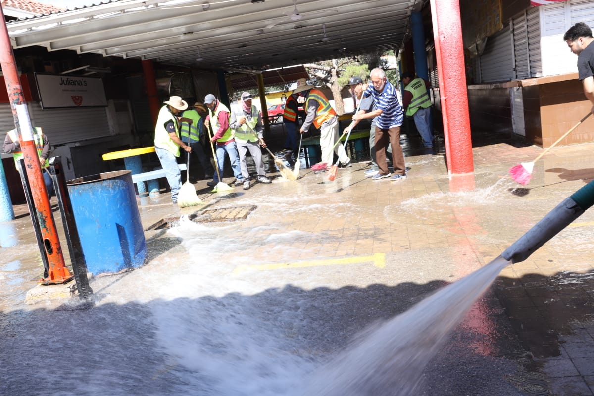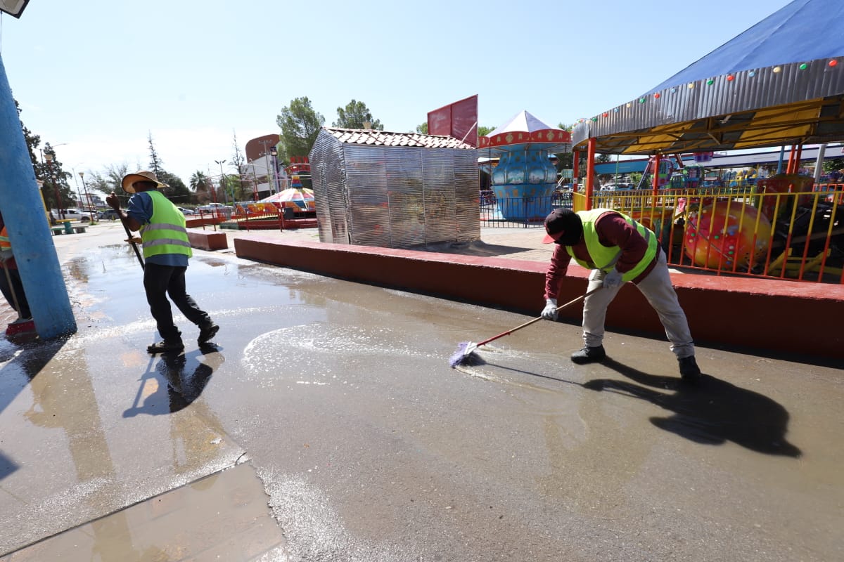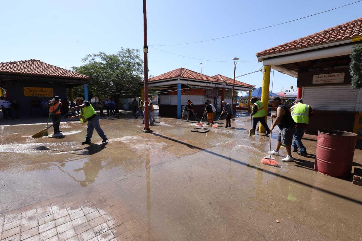 Esta mañana, el personal de Limpia se desplegó sobre el área de venta de alimentos del Parque Borunda para limpiar los pasillos con la ayuda de varios comerciantes que se sumaron al operativo.