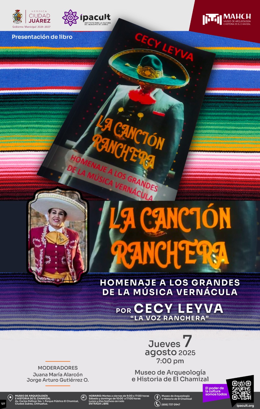 El Instituto para la Cultura del Municipio de Juárez (IPACULT) hace una cordial invitación a toda la comunidad para asistir a la presentación del libro “La canción Ranchera”, obra de la intérprete y autora Cecy Leyva.