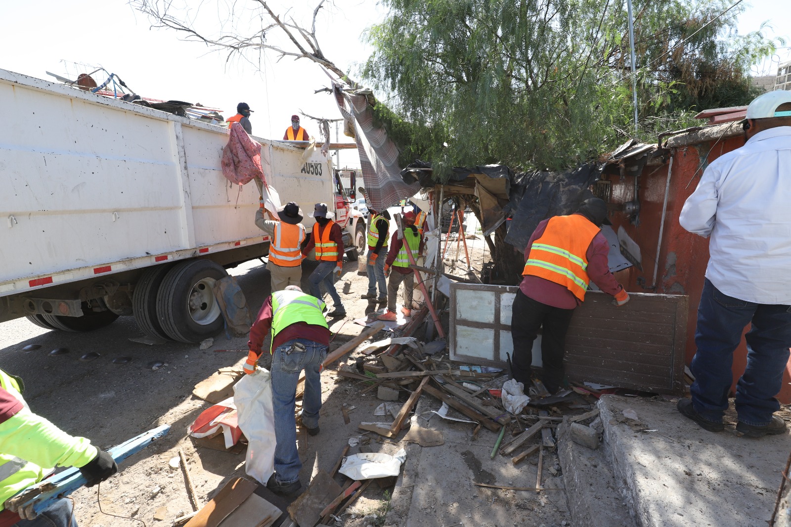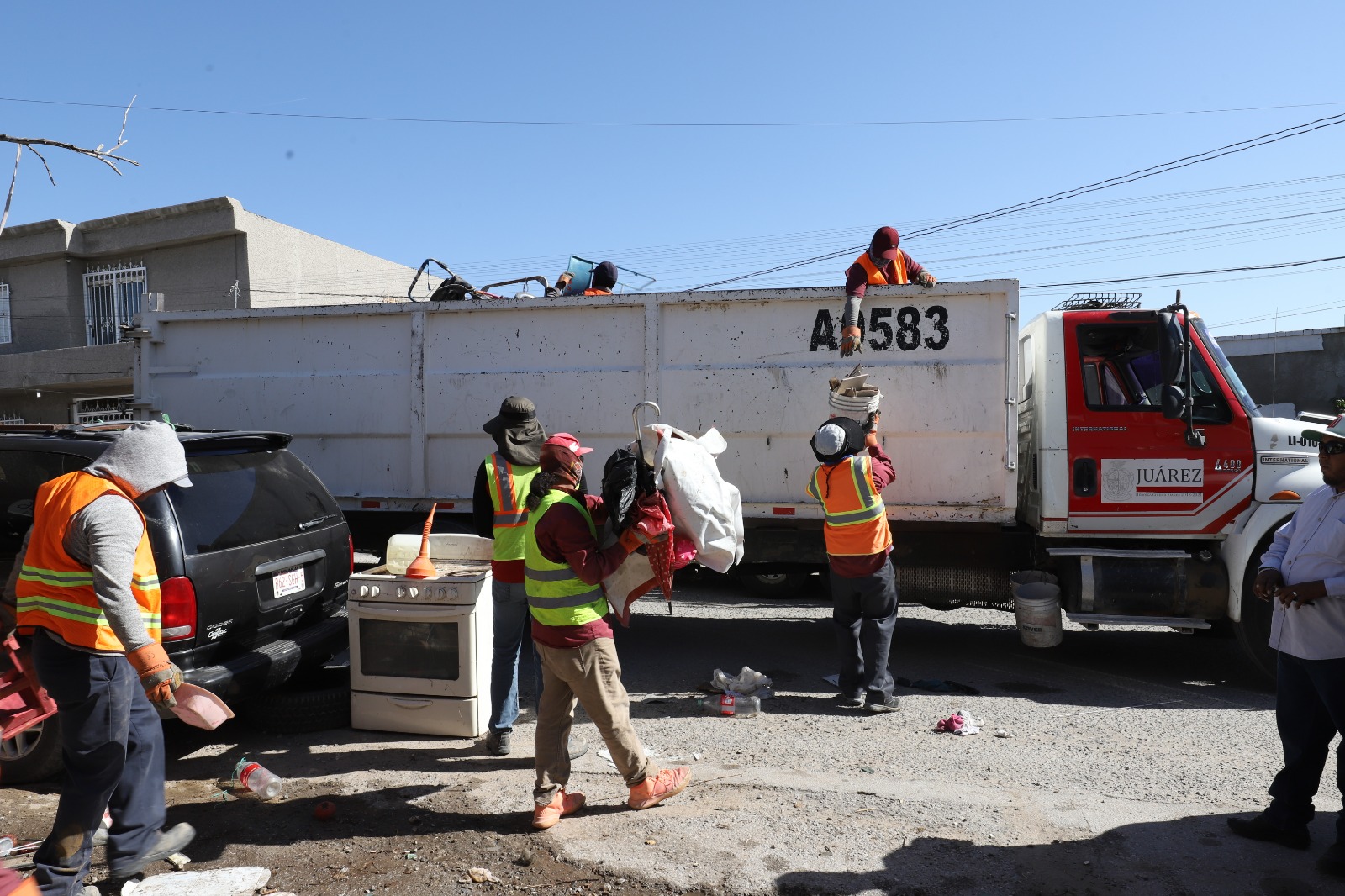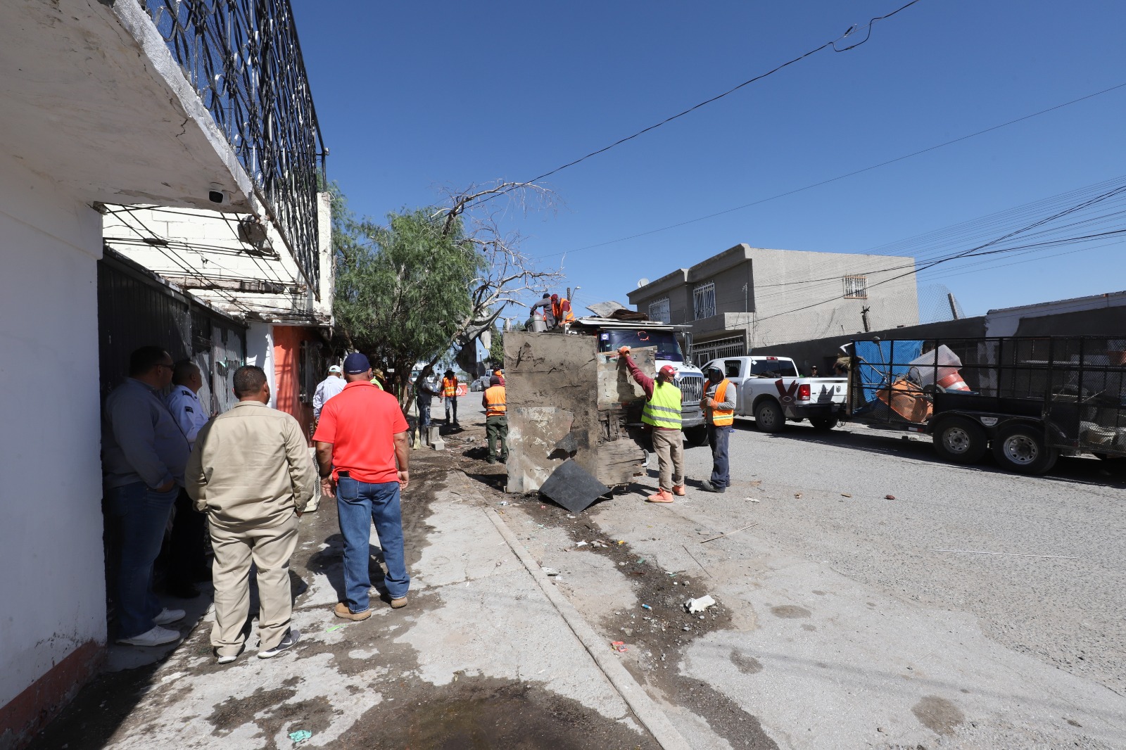 El operativo conjunto se realizó en la calle Grafito e Hidrógeno, donde participaron representantes de la Dirección General de Servicios Públicos Municipales, Dirección General de Desarrollo Urbano, Dirección de Ecología, Dirección General de Protección Civil, Secretaría de Seguridad Pública Municipal y la Coordinación General de Seguridad Vial.