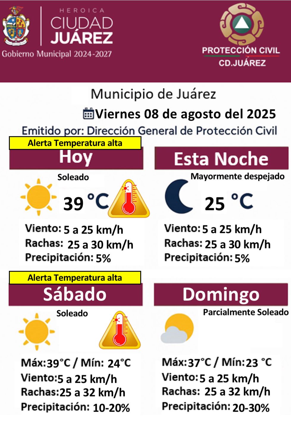 La Dirección General de Protección Civil del Municipio de Juárez emitió una alerta preventiva por altas temperaturas que se registrarán durante los próximos días, por lo que se exhorta a la población a extremar precauciones.