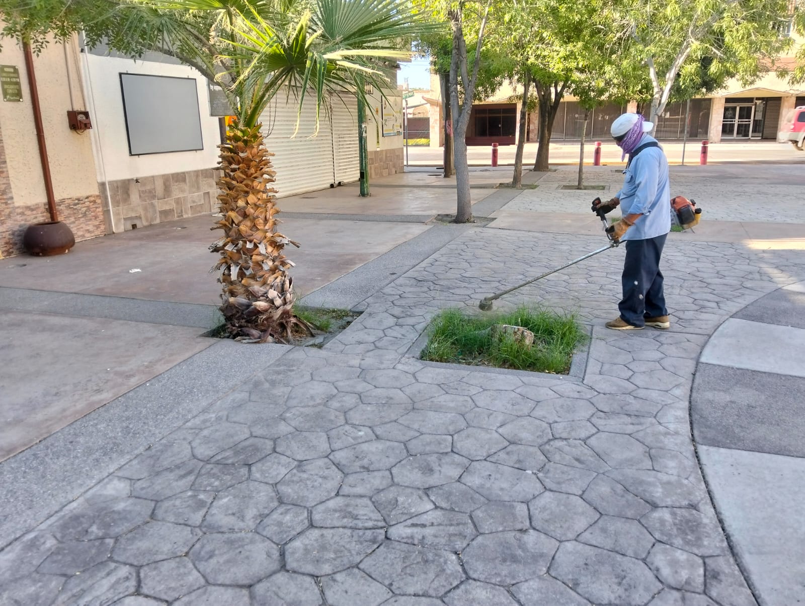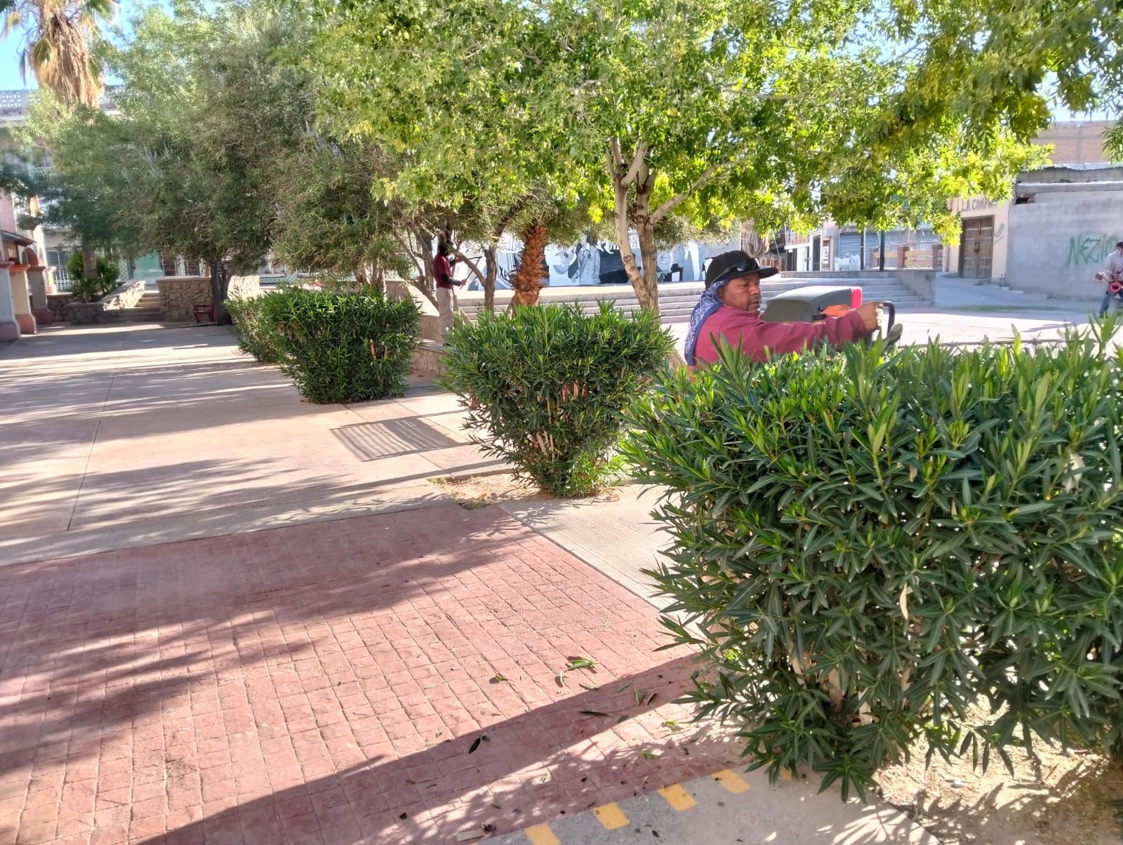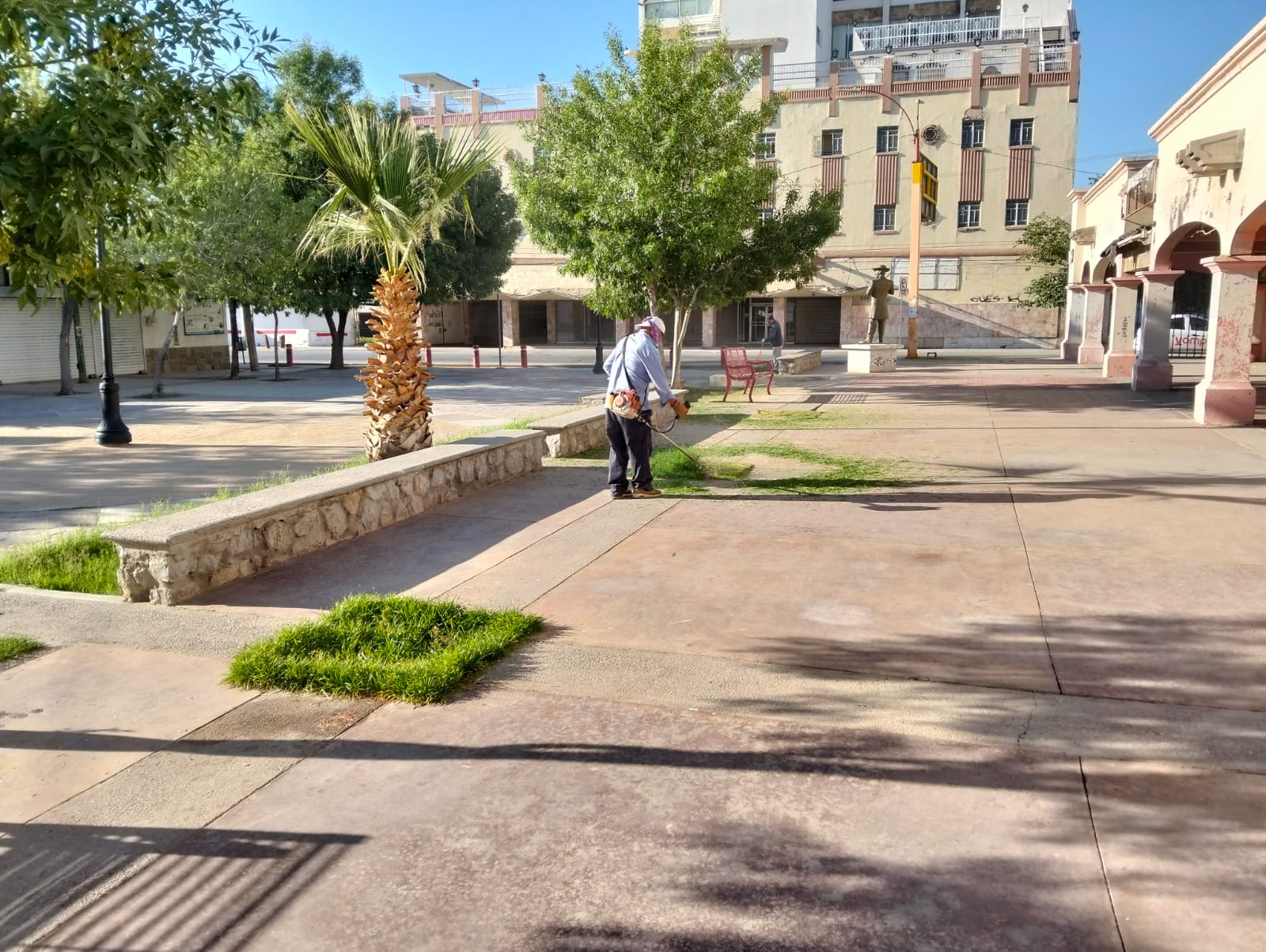 Como parte de las acciones que lleva a cabo la Dirección General de Servicios Públicos Municipales en las distintas áreas verdes de la ciudad, personal de la Dirección de Parques y Jardines atendió la plaza Tin Tan, localizada en la Zona Centro, a un costado del Mercado Juárez.