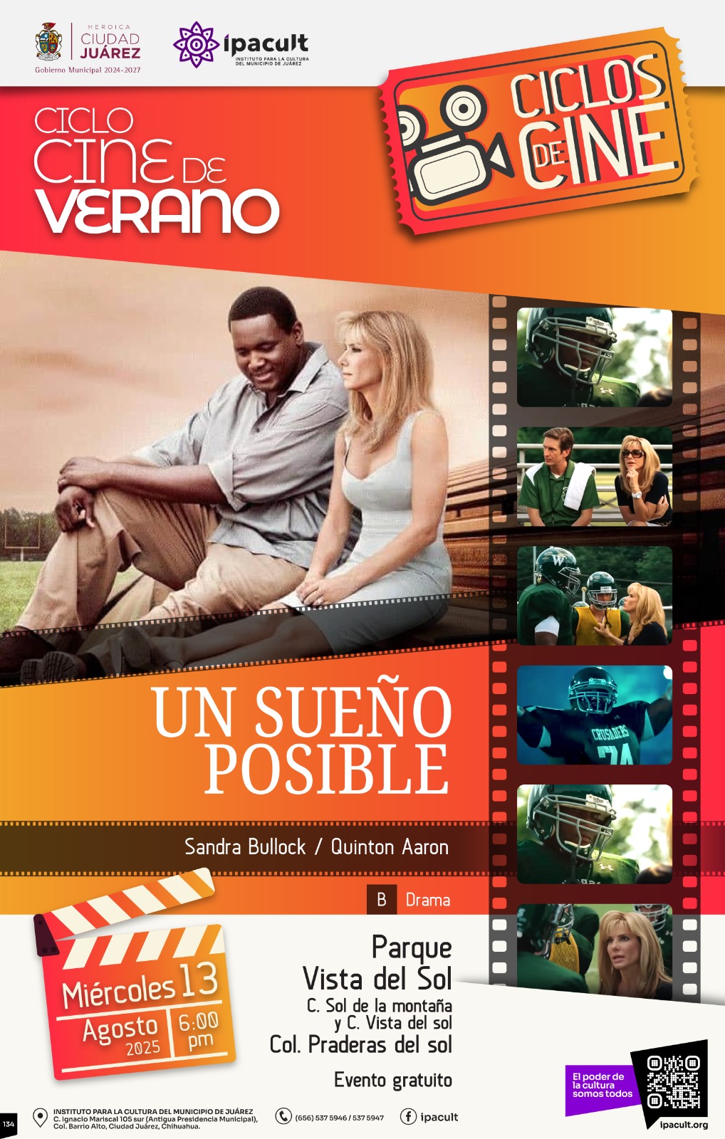 La primera función se llevará a cabo a las 6:00 de la tarde en el Parque Sol del Peñasco, ubicado en el fraccionamiento Praderas del Sol, con la proyección de la película Un sueño posible (The Blind Side).