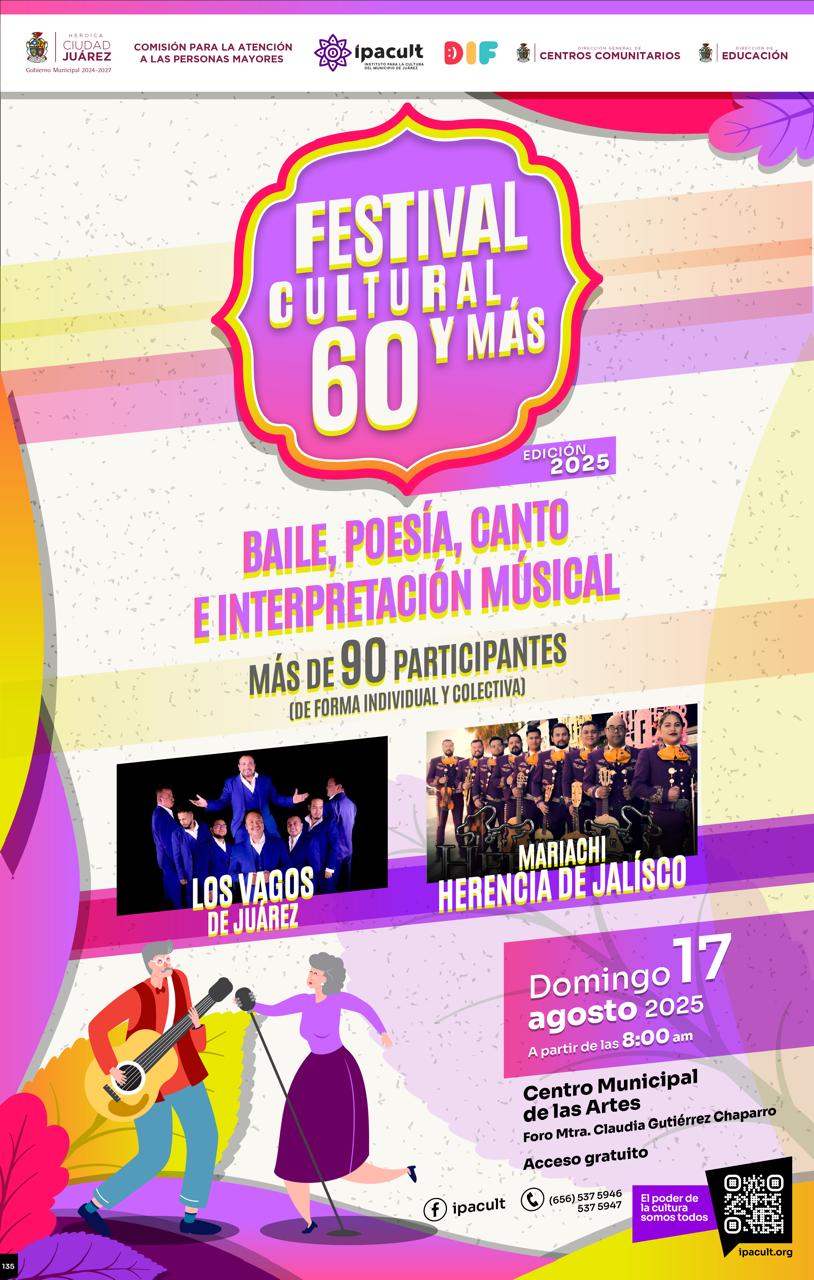 El “Festival Cultural 60 y más”, organizado por el Gobierno Municipal, la Comisión Edilicia para la Atención a Personas Mayores y el Instituto para la Cultura del Municipio de Juárez (IPACULT), reunirá a decenas de participantes en un evento que busca darles un espacio digno para mostrar su talento y compartirlo con toda la comunidad.