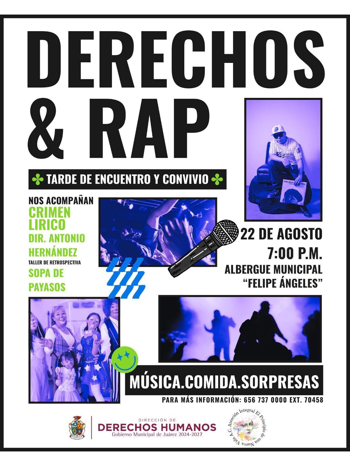 La Dirección de Derechos Humanos invita a la comunidad al evento Derechos y Rap, el cual se llevará a cabo el próximo viernes 22 de agosto a las 7:00 de la tarde en el albergue Felipe Ángeles, ubicado en la colonia del mismo nombre.