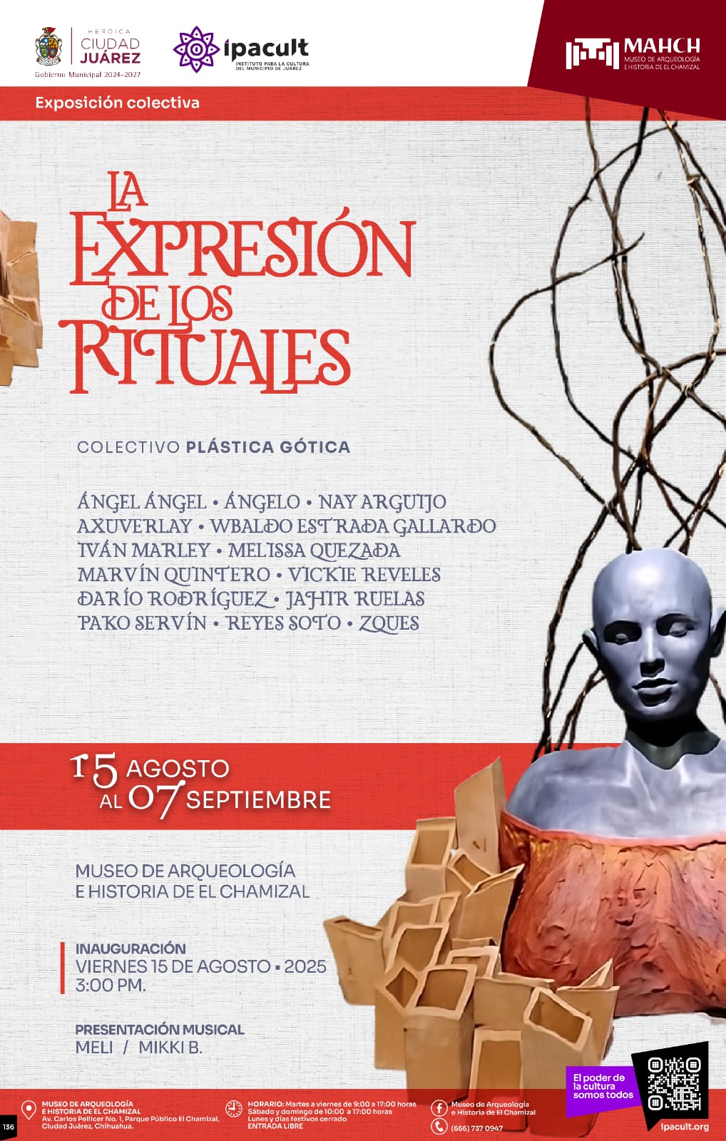 El Instituto para la Cultura del Municipio de Juárez (IPACULT) invita a la ciudadanía a la inauguración de la exposición pictórica “La expresión de los rituales”, que se llevará a cabo este viernes 15 de agosto a las 3:00 de la tarde en el Museo de Arqueología e Historia de El Chamizal (MAHCH).