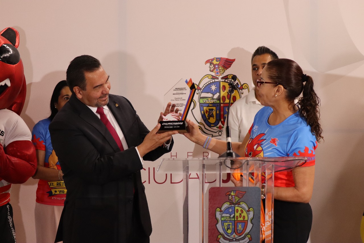 Durante la conferencia, la Organización Chupacabras le entregó un reconocimiento al alcalde, por el apoyo que ha dado al deporte y en especial a la carrera chupacabras.