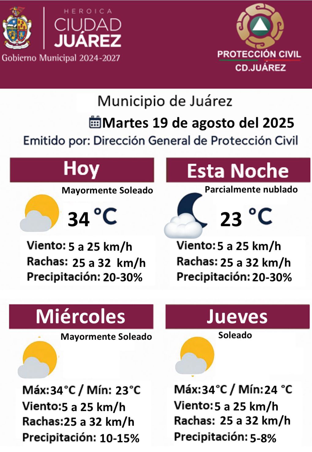 La Dirección General de Protección Civil del Municipio informó el pronóstico del clima para este martes 19 de agosto y los próximos días.