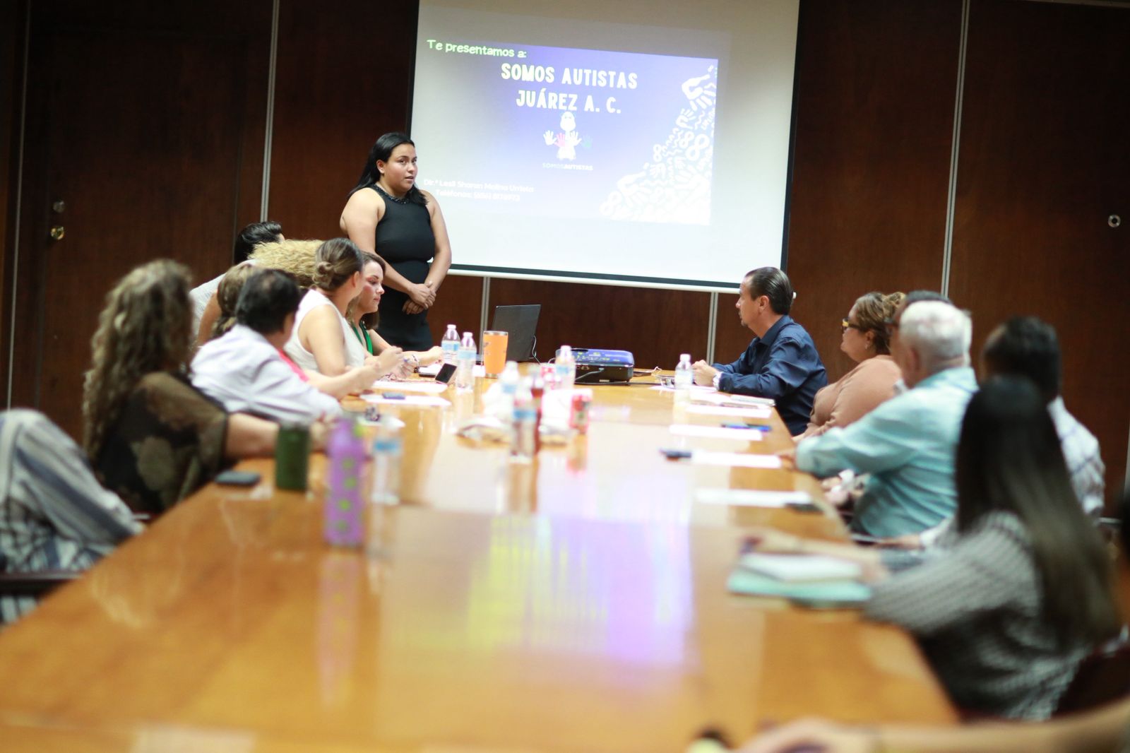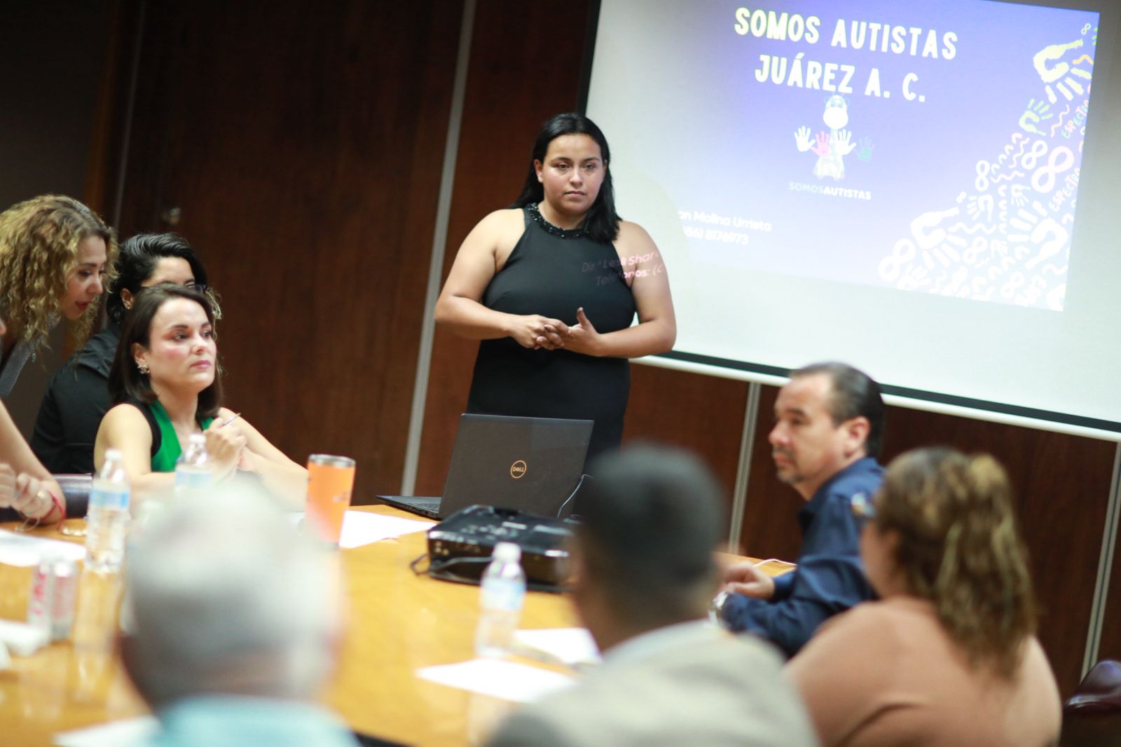 Durante la reunión de las comisiones conjuntas de Educación y Planeación del Desarrollo Municipal, la integrante de la asociación Somos Autistas Juárez A.C., Leslie Sharon Molina Urrieta, presentó a los regidores el proyecto Espacios Seguros en las aulas, a través de la visibilización e inclusión, de niñas, niños y adolescentes neurodivergentes y neurotípicos.
