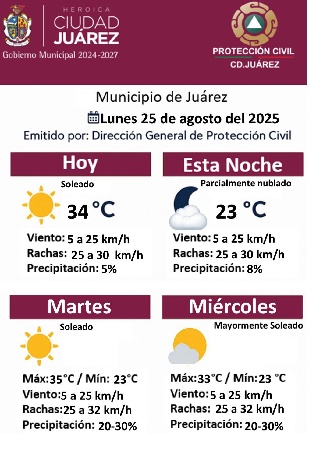 La Dirección General de Protección Civil del Municipio de Juárez dio a conocer el pronóstico del clima para este lunes 25 de agosto de 2025 y los próximos días.