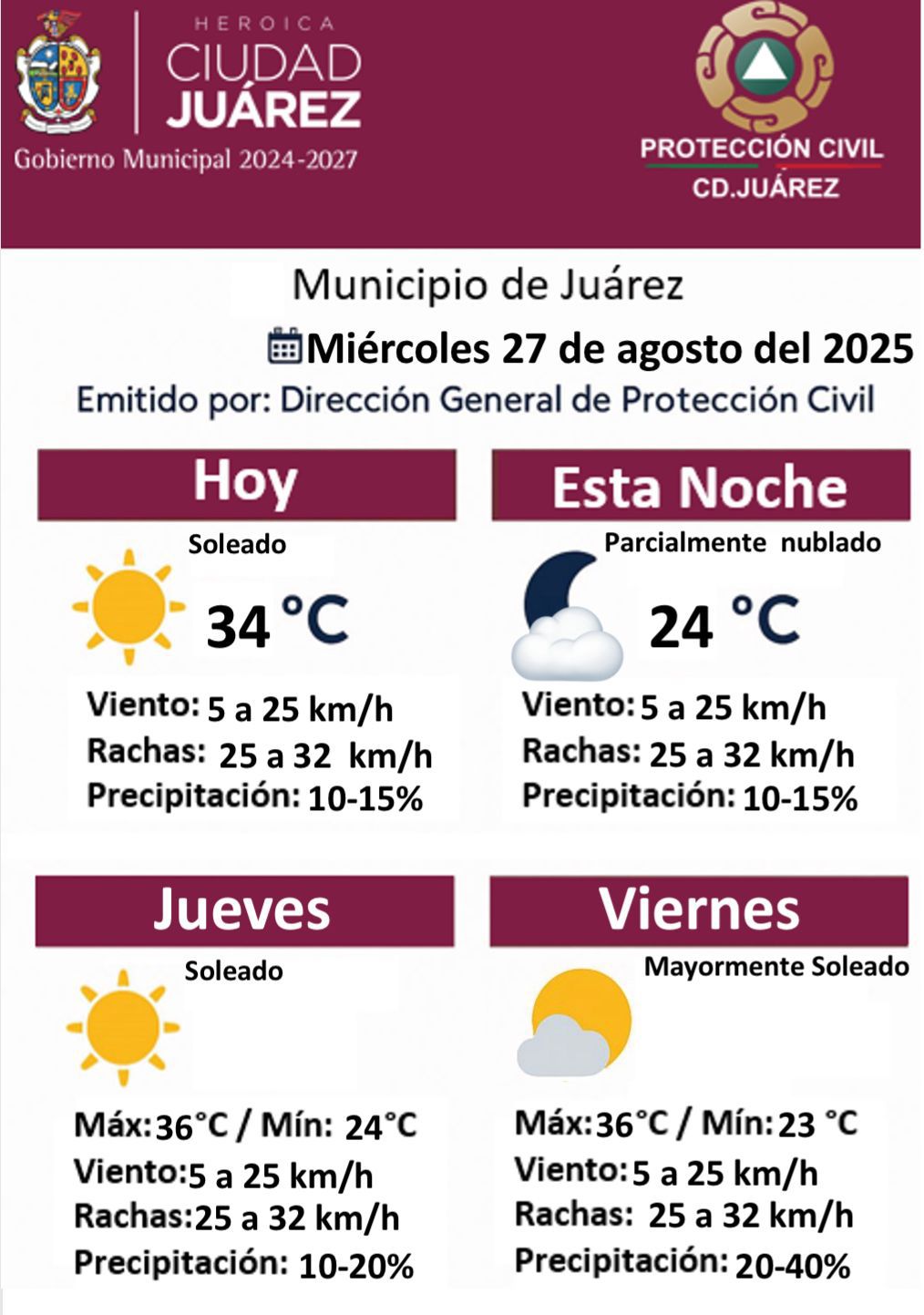 Este miércoles 27 de agosto de 2025 se espera un día soleado con una temperatura máxima de 34 grados centígrados y mínima de 24, acompañado de vientos de 5 a 25 kilómetros por hora, con rachas de 25 a 32 y una probabilidad de precipitación de entre el 10 y 15 por ciento.