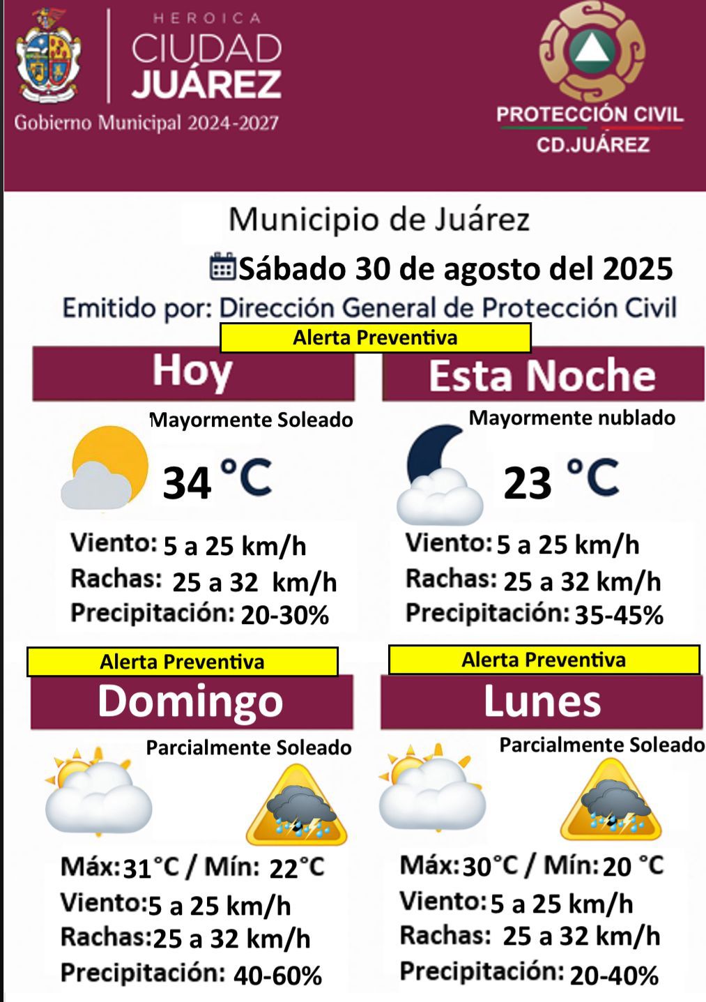 La Dirección General de Protección Civil del Municipio de Juárez emitió una alerta preventiva para este fin de semana, debido a las condiciones climatológicas que se esperan en la región.