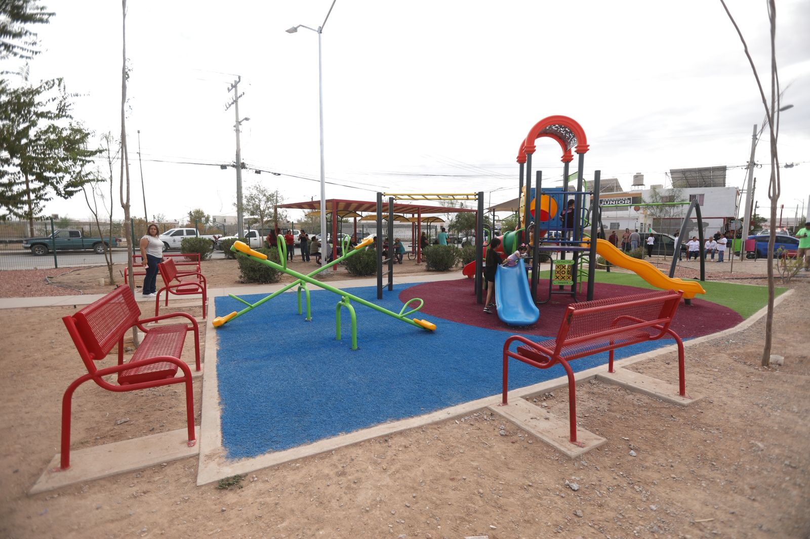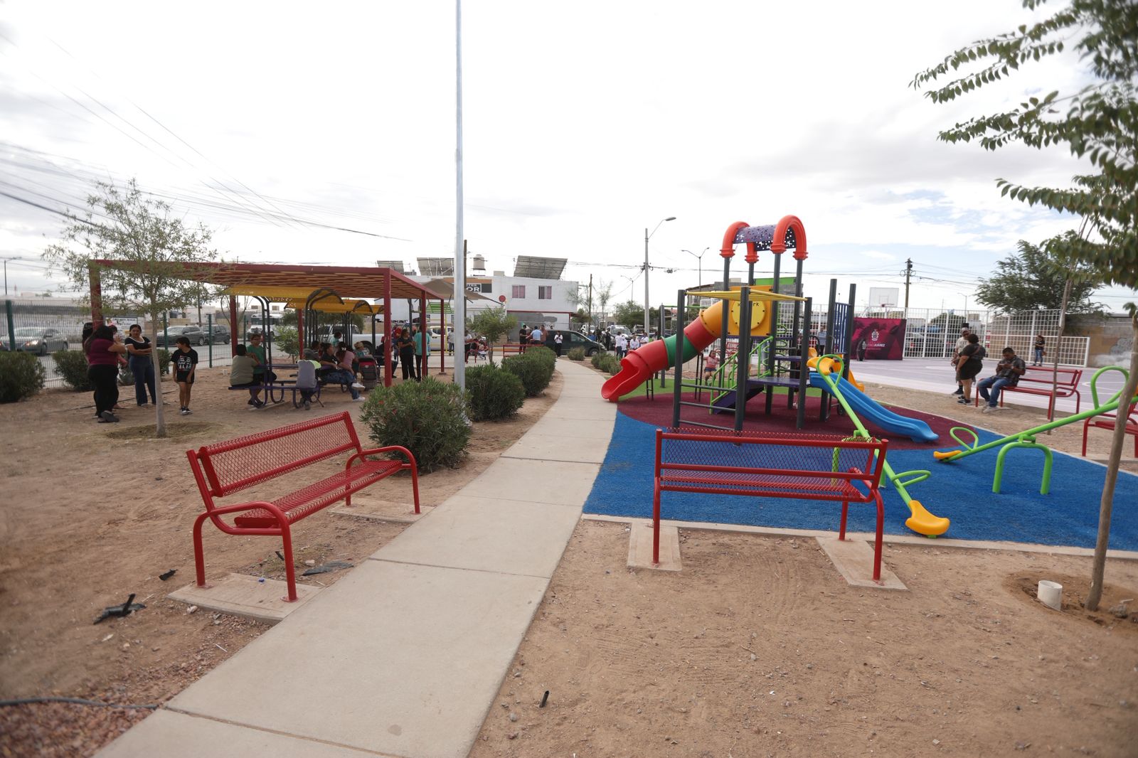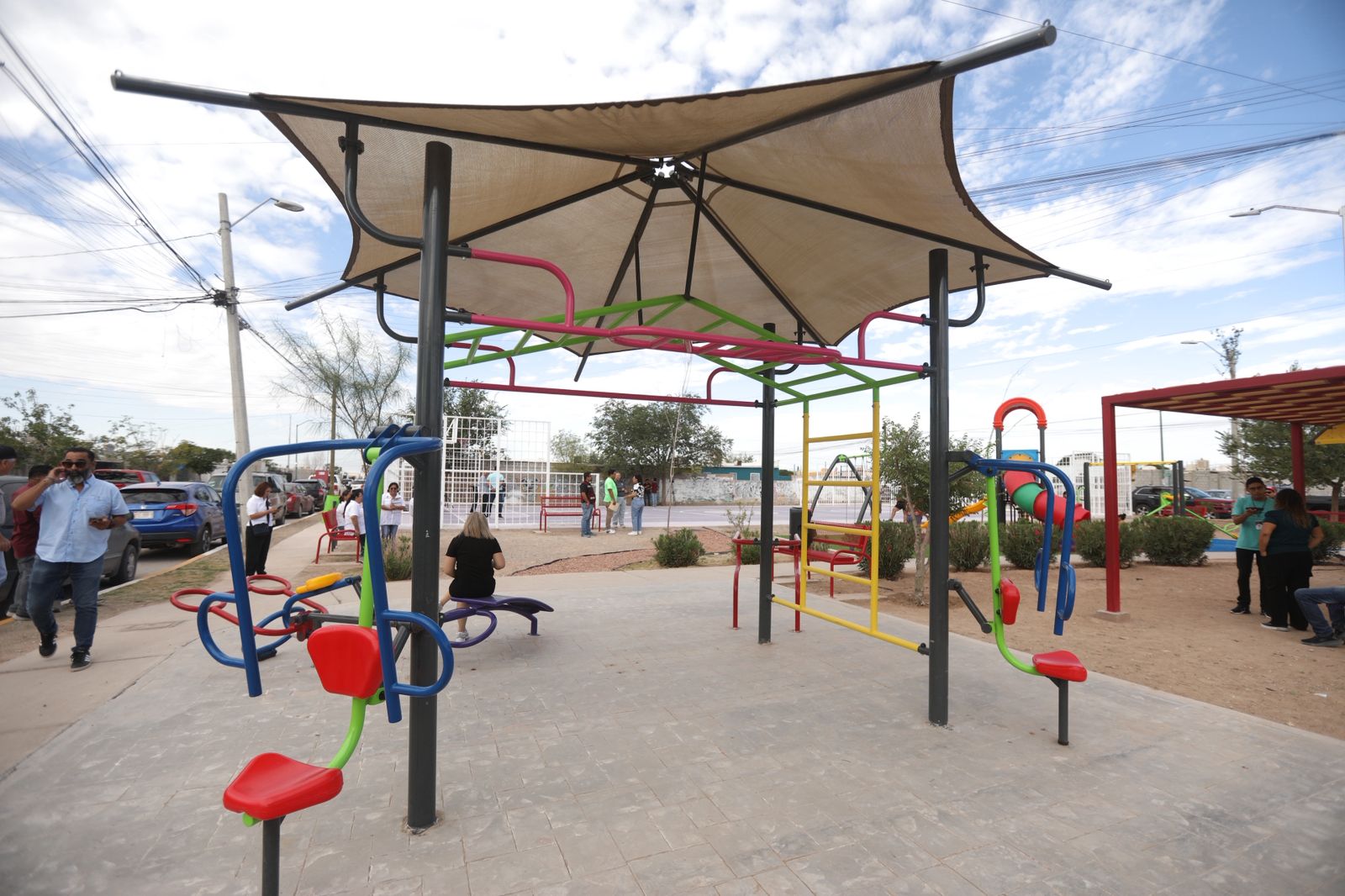 La obra se hizo con una inversión de 3 millones 050 mil pesos y cuenta con cancha de usos múltiples, módulo con juegos infantiles, gimnasio al aire libre, pérgola, mobiliario urbano, así como pasto sintético, rampas, guarniciones y árboles de especie palo verde, mezquite y atmosférica.