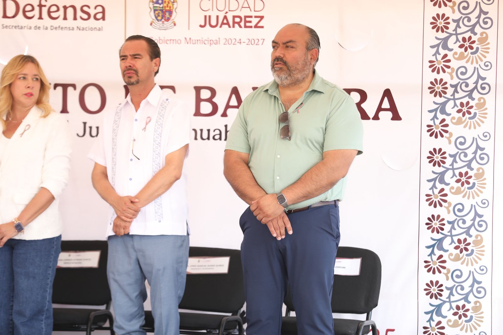 El Presidente Municipal, Cruz Pérez Cuéllar encabezó este día el izamiento de la bandera en el área de El Chamizal, ceremonia oficial con la que se da inicio a las celebraciones del mes patrio.