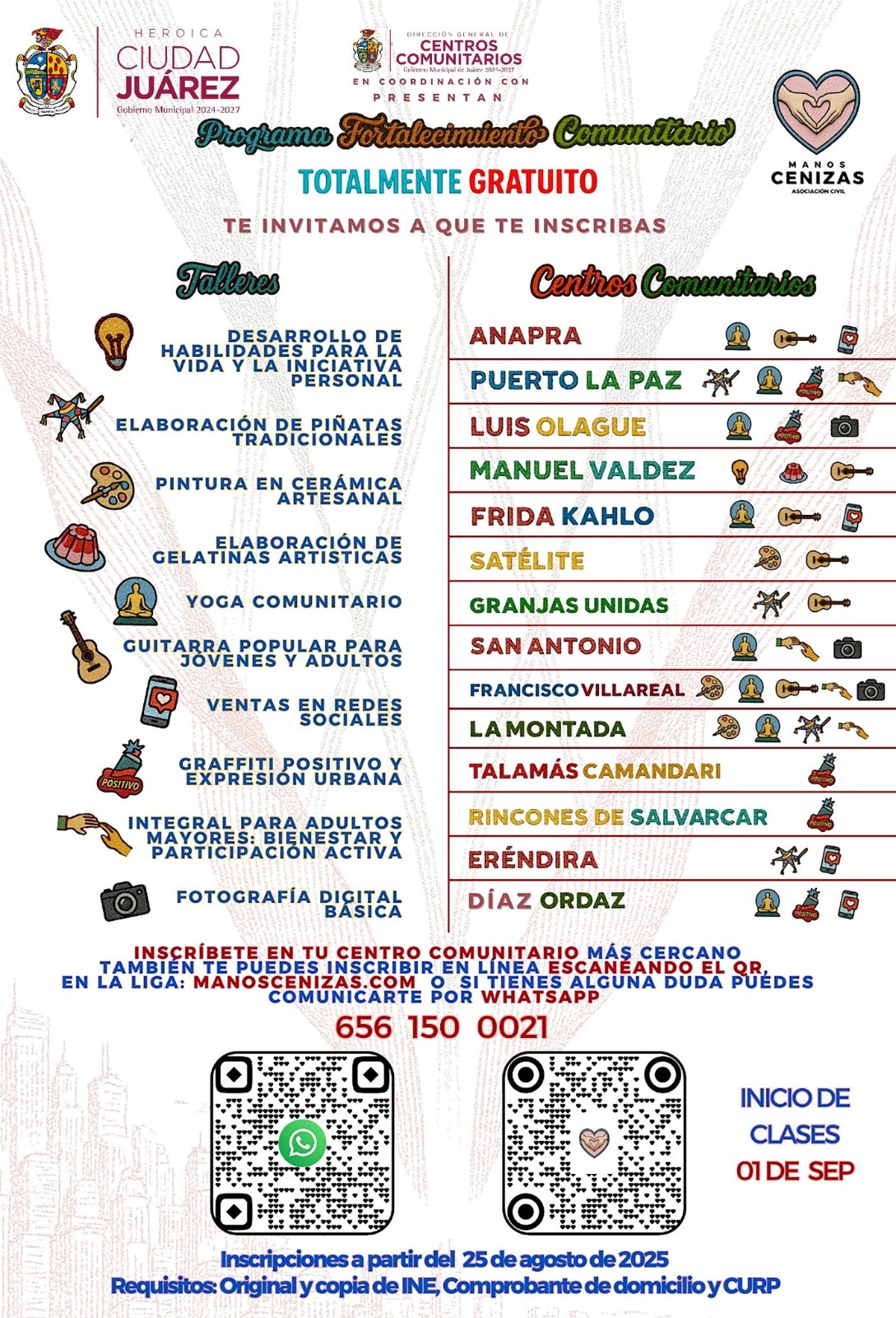 La Asociación Civil Manos Cenizas, en colaboración con la Dirección General de Centros Comunitarios, ofrece a toda la ciudadanía diversos talleres a partir de este lunes 1 de septiembre.