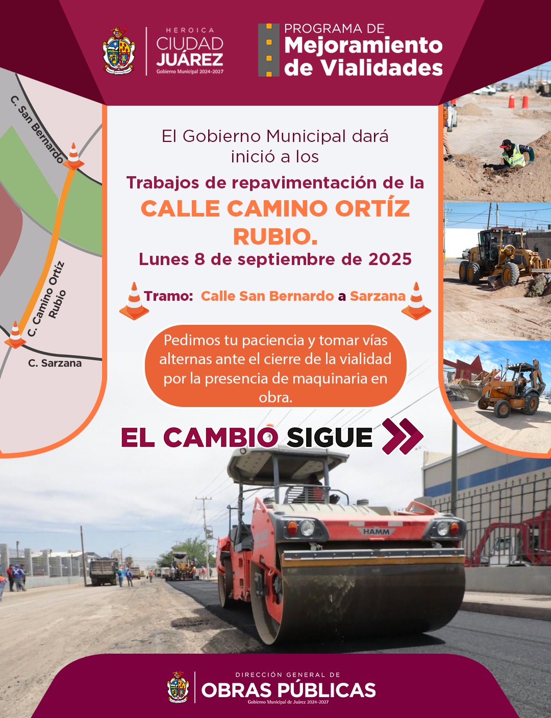 Como parte del mejoramiento de vialidades en los distintos sectores de la ciudad, la Dirección General de Obras Públicas iniciará el próximo lunes 8 de septiembre con la repavimentación de la calle Camino Ortiz Rubio, en la colonia Misión de Senecú.