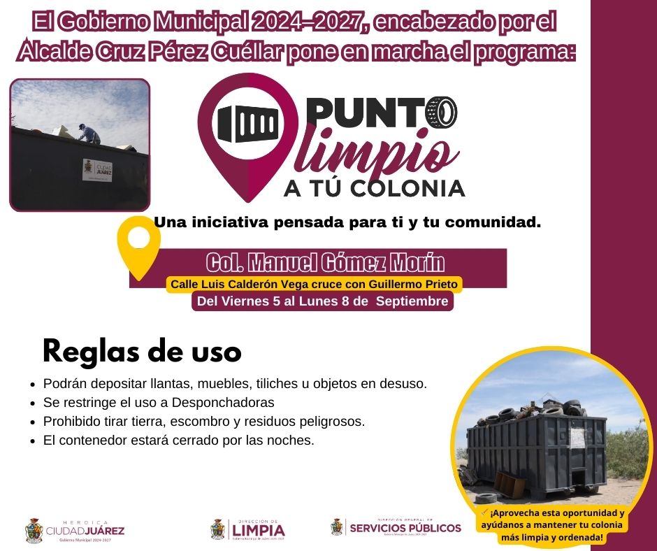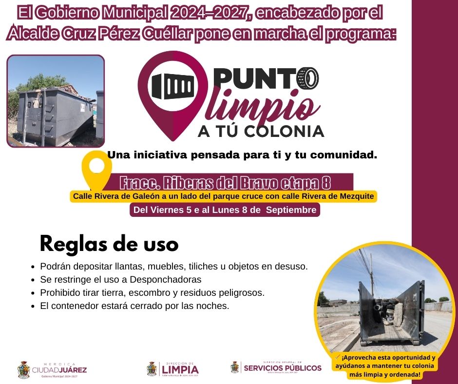 La Dirección de Limpia anunció que, del viernes 5 al lunes 8 de septiembre, se pusieron en operación tres nuevos Puntos Limpios en diferentes colonias de la ciudad, con el objetivo de facilitar a la ciudadanía la disposición correcta de desechos voluminosos o de manejo especial, como muebles, llantas, ramas y colchones.